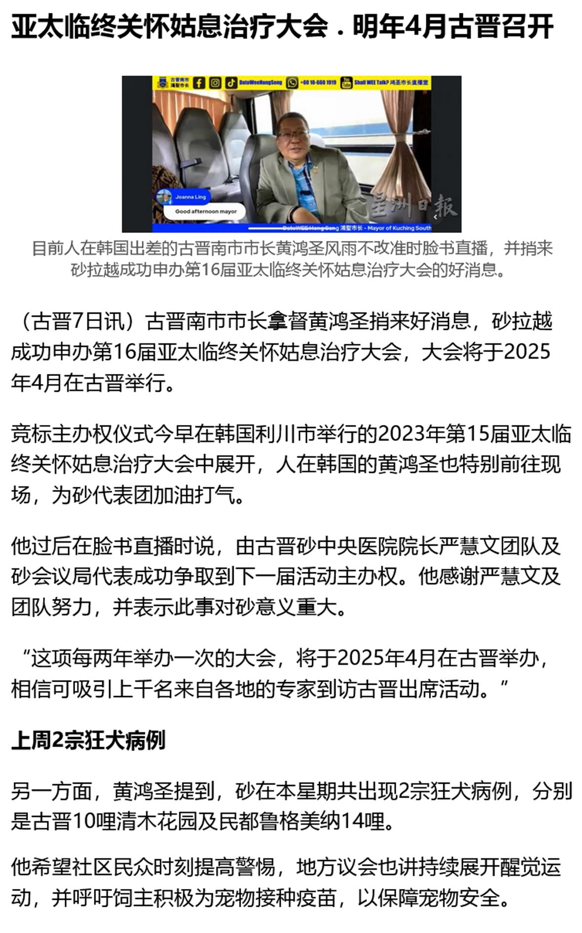 亚太临终关怀姑息治疗大会 明年4月古晋召开