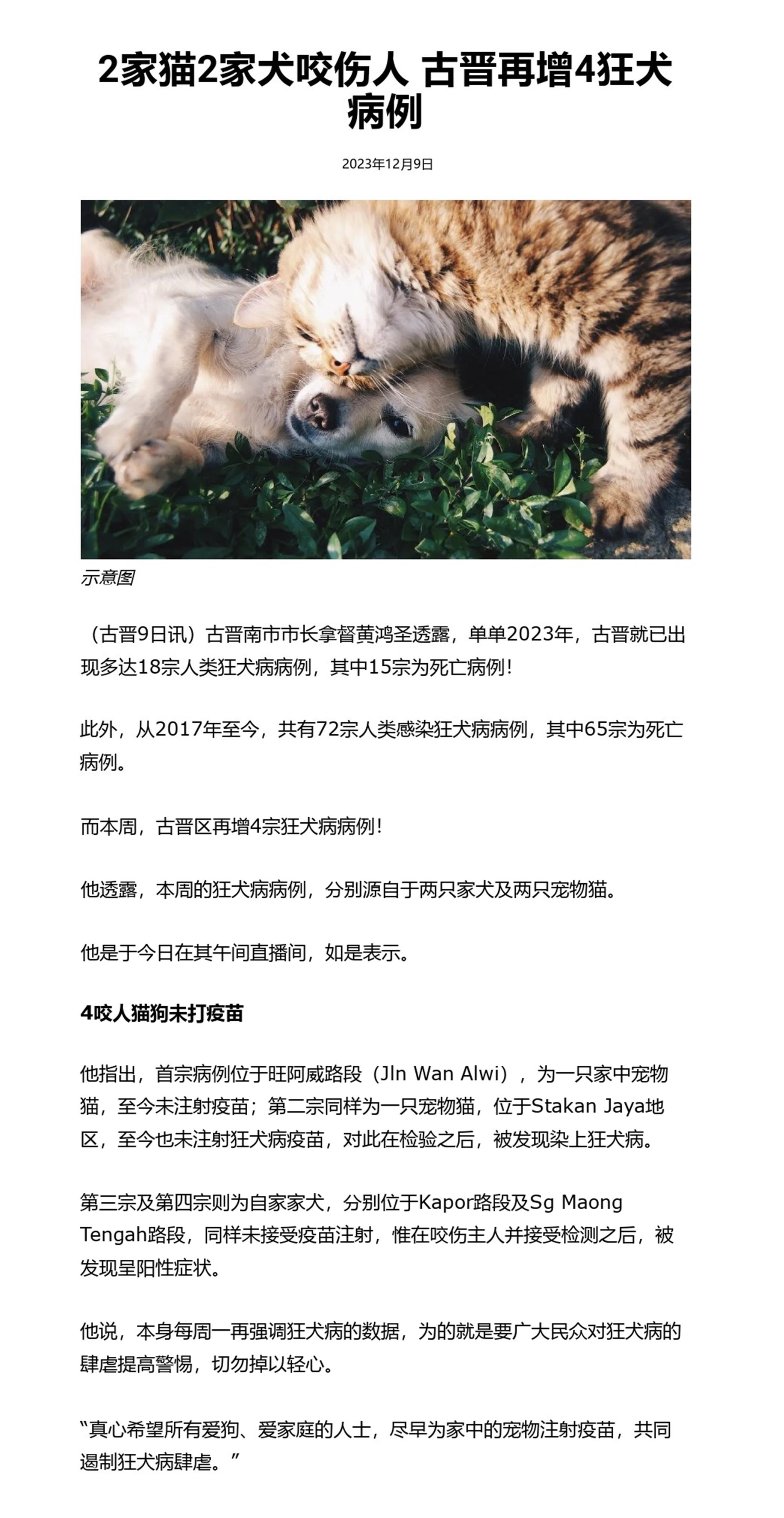 2家猫2家犬咬伤人 古晋再增4狂犬病例