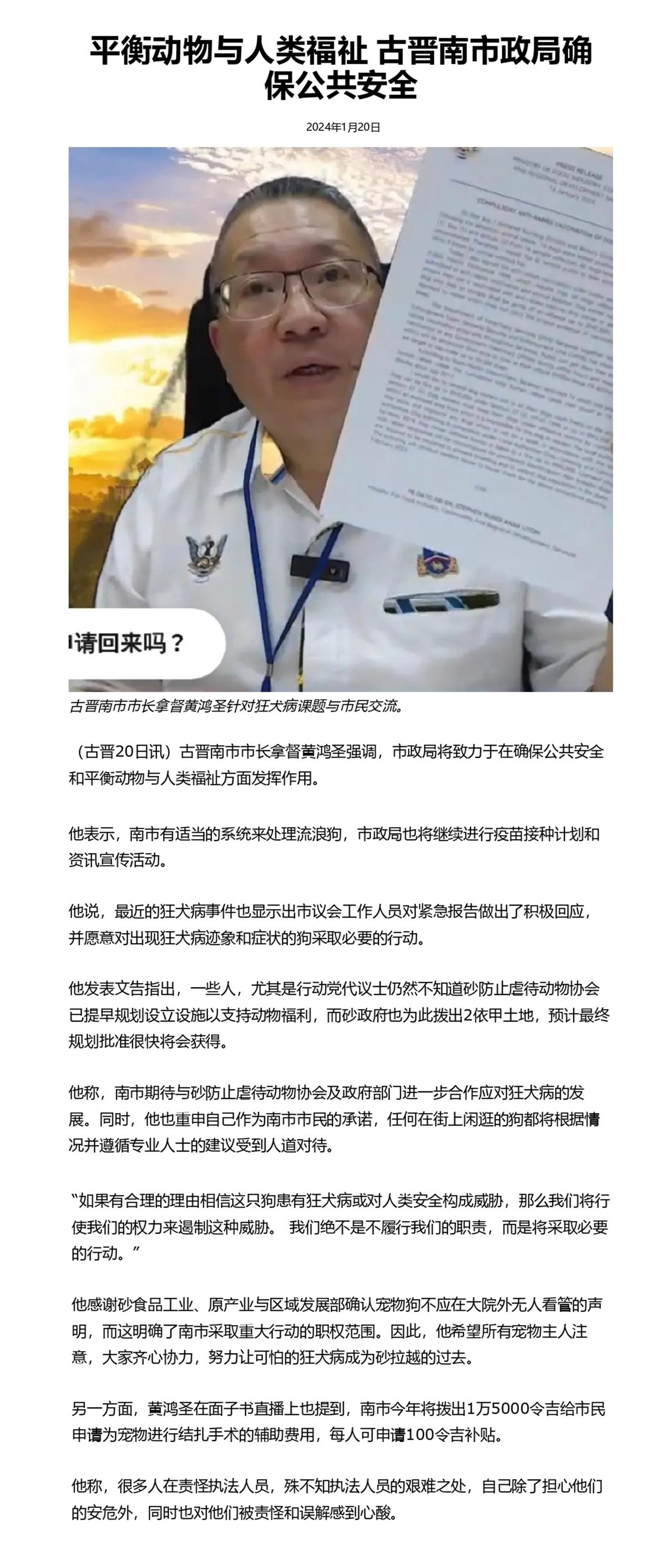 平衡动物与人类福祉 古晋南市政局确保公共安全
