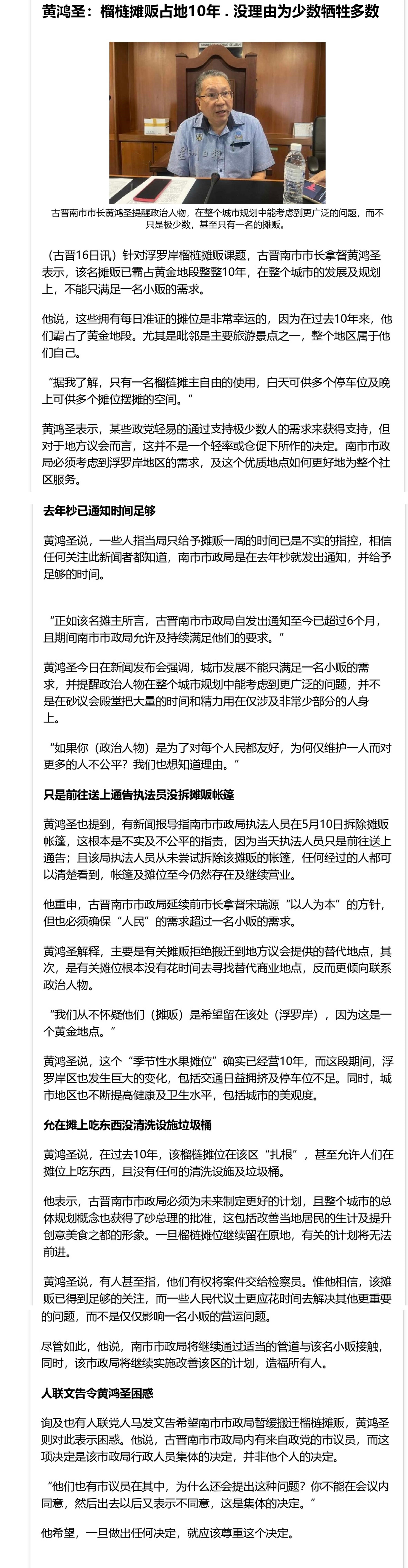 黄鸿圣:榴梿摊贩占地10年 . 没理由为少数牺牲多数