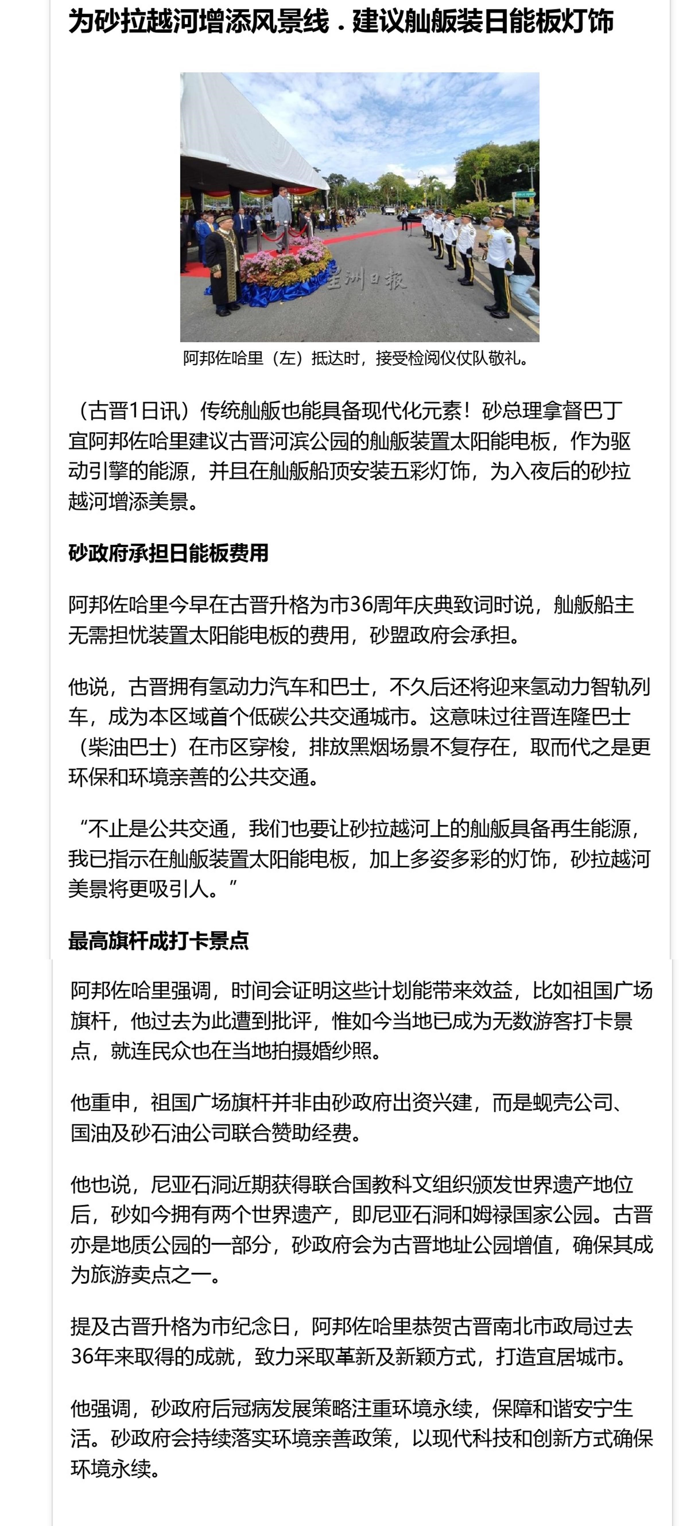 为砂拉越河增添风景线 . 建议舢舨装日能板灯饰