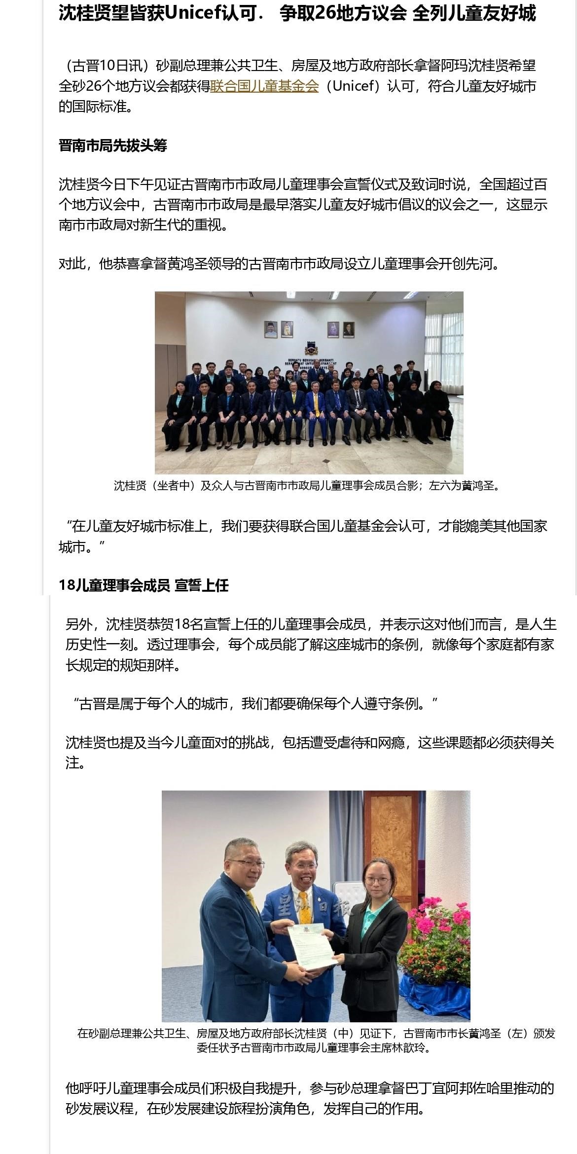沈桂贤望皆获Unicef认可. 争取26地方议会 全列儿童友好城