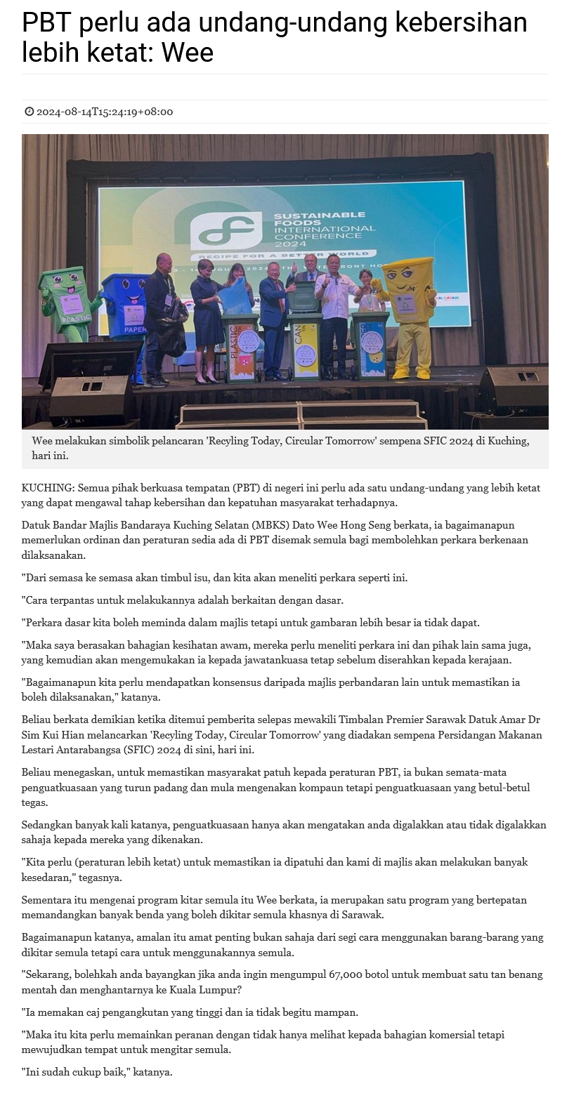Source of News: https://www.utusanborneo.com.my/2024/08/14/pbt-perlu-ada-undang-undang-kebersihan-lebih-ketat-wee