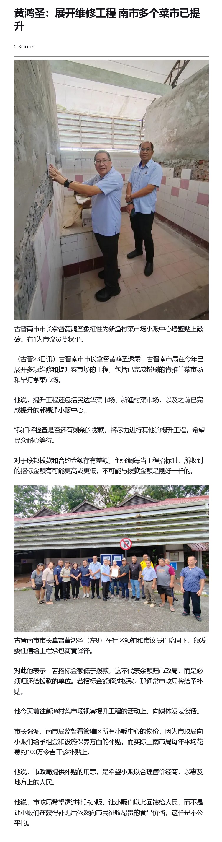 黄鸿圣:展开维修工程 南市多个菜市已提升