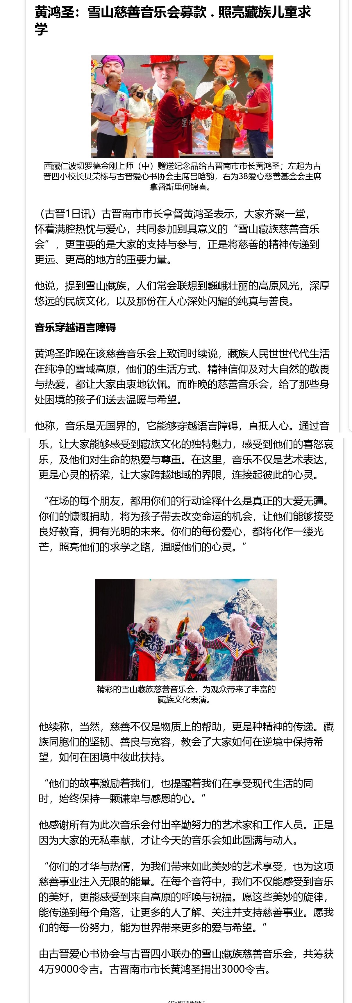 黄鸿圣:雪山慈善音乐会募款 . 照亮藏族儿童求学
