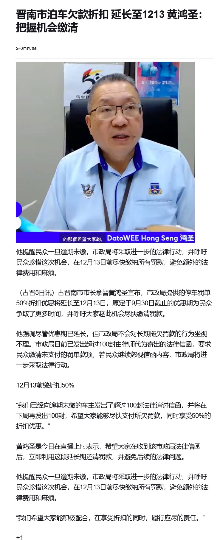 晋南市泊车欠款折扣 延长至1213 黄鸿圣:把握机会缴清