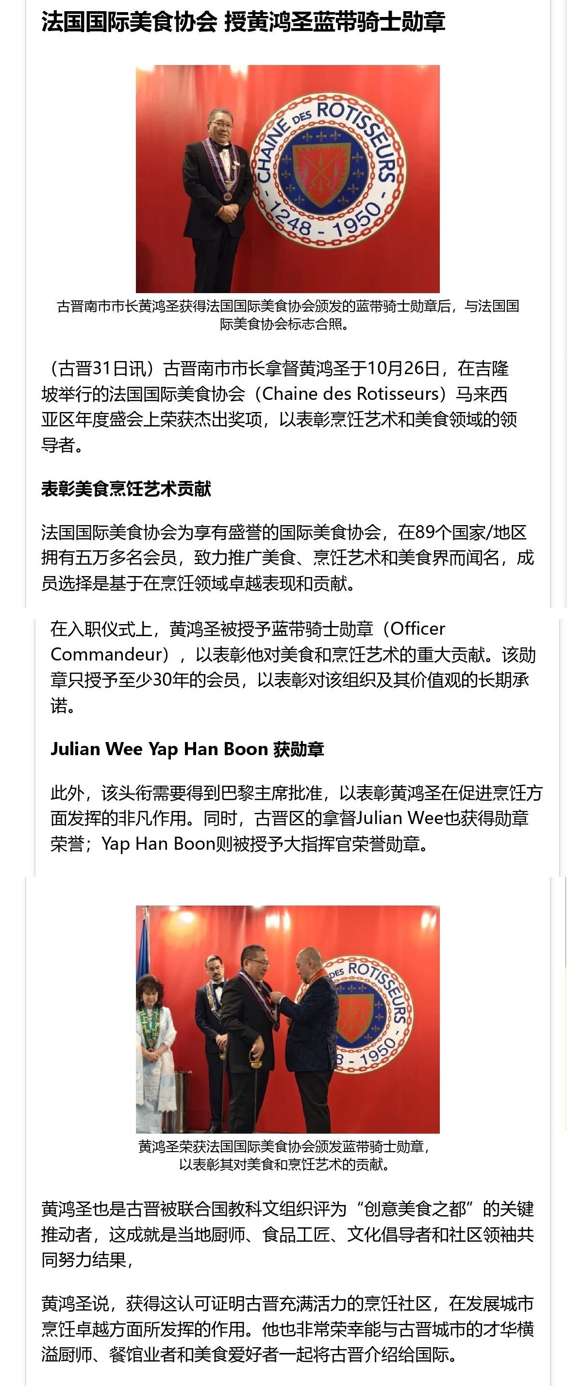 法国国际美食协会 授黄鸿圣蓝带骑士勋章