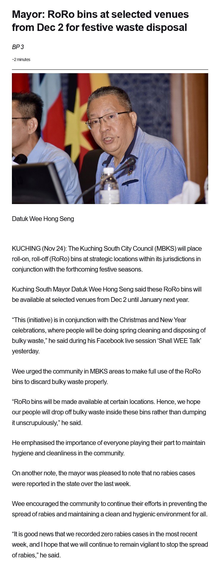 Mayor: RoRo bins at selected venues from Dec 2 for festive waste disposal