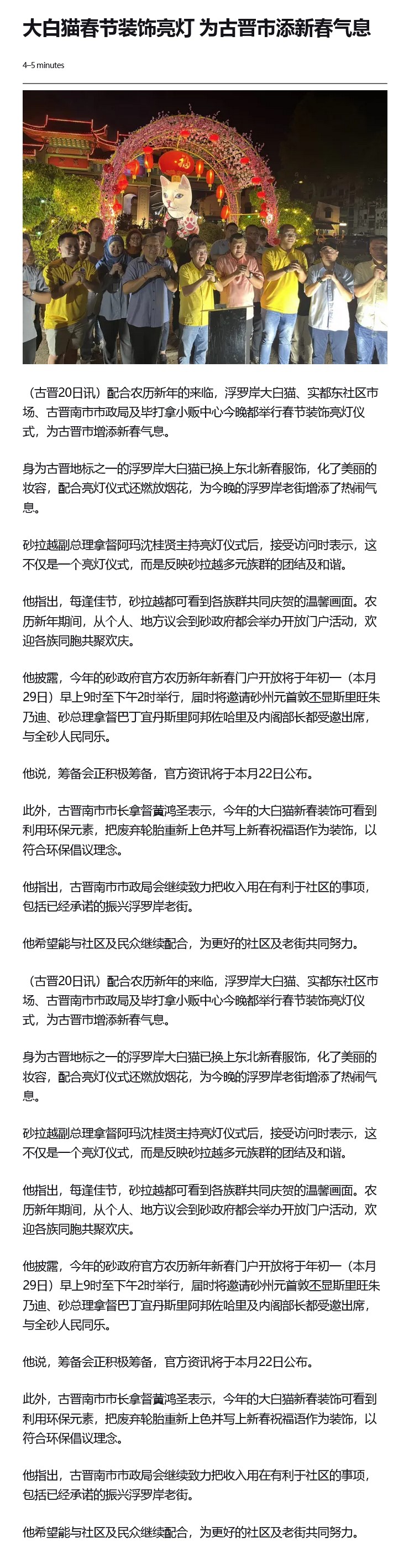 大白猫春节装饰亮灯 为古晋市添新春气息