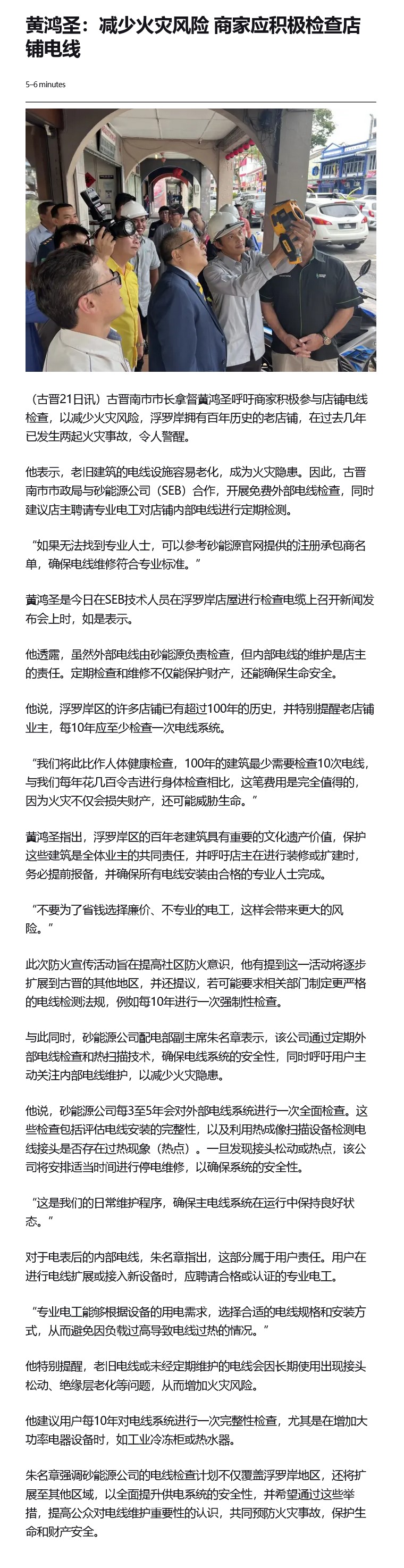 黄鸿圣:减少火灾风险 商家应积极检查店铺电线