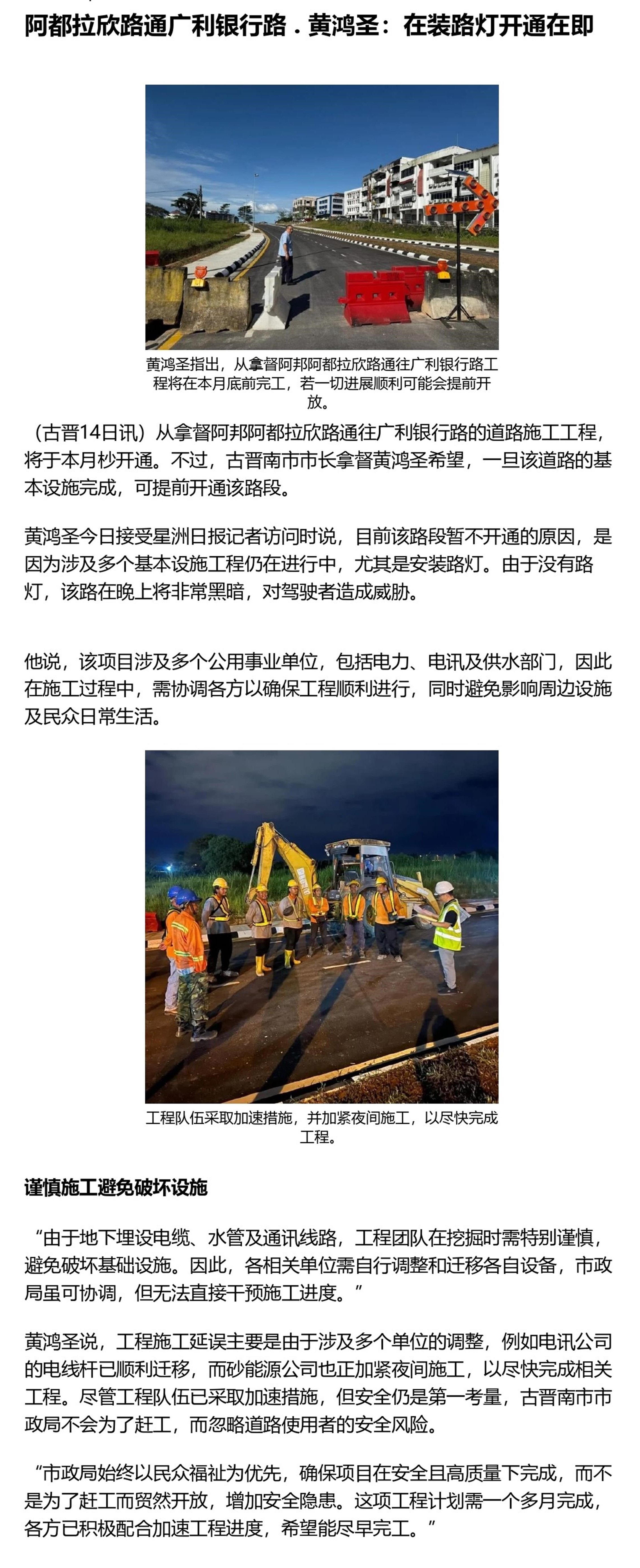 阿都拉欣路通广利银行路 . 黄鸿圣:在装路灯开通在即
