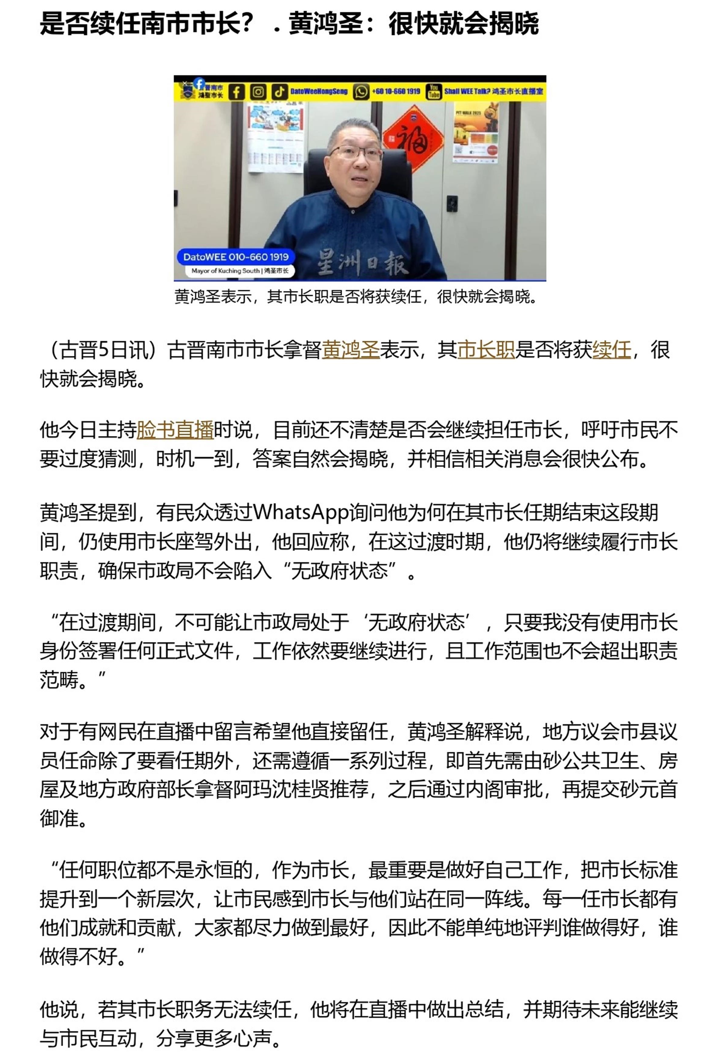是否续任南市市长? . 黄鸿圣:很快就会揭晓