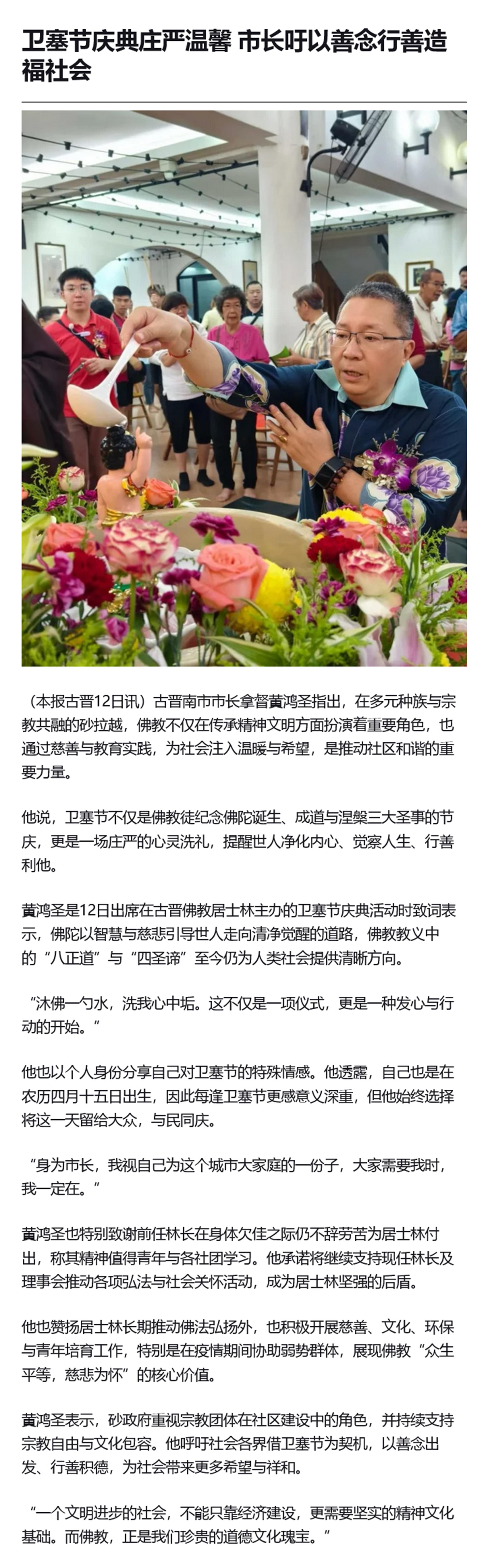 卫塞节庆典庄严温馨 市长吁以善念行善造福社会
