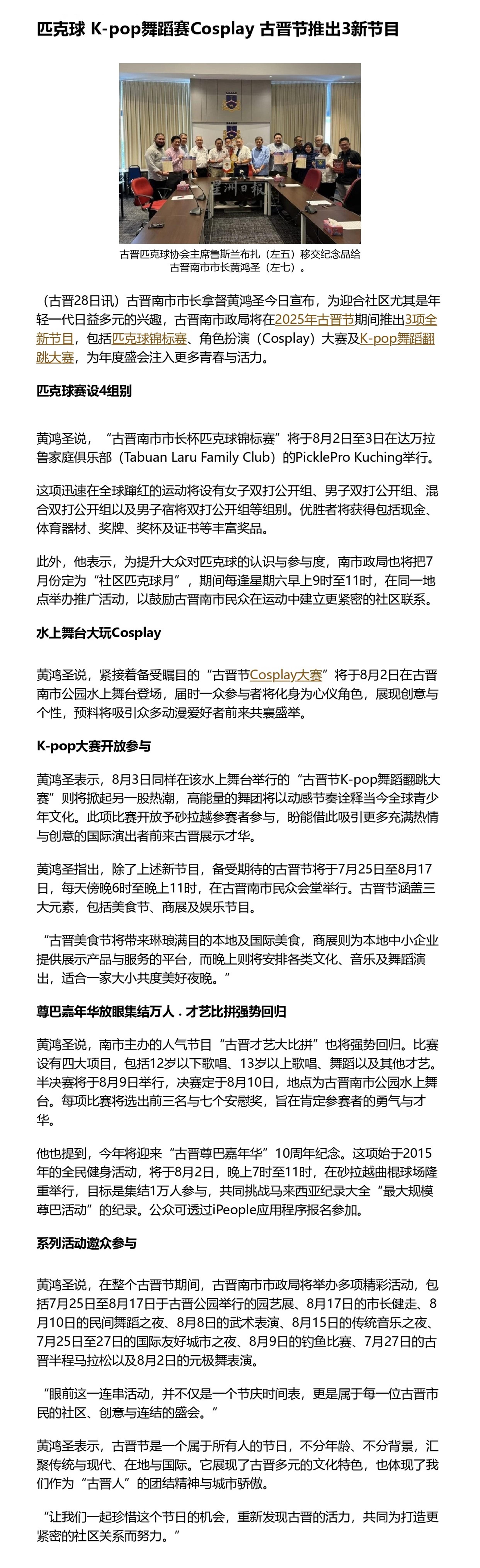 匹克球 K-pop舞蹈赛Cosplay 古晋节推出3新节目