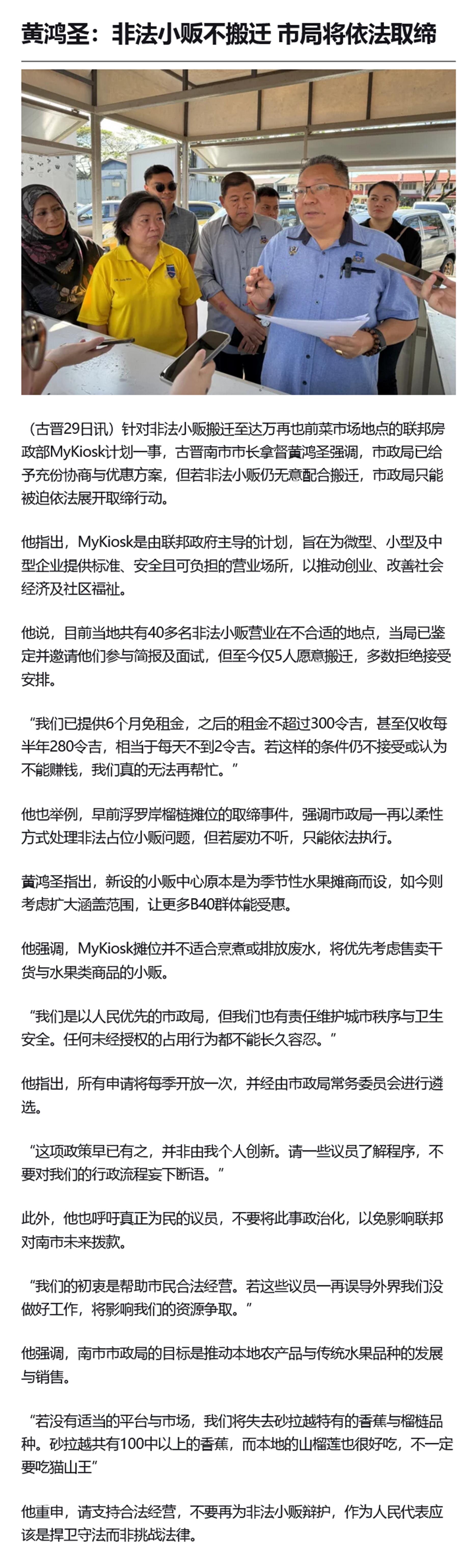 黄鸿圣: 非法小贩不搬迁 市局将依法取缔