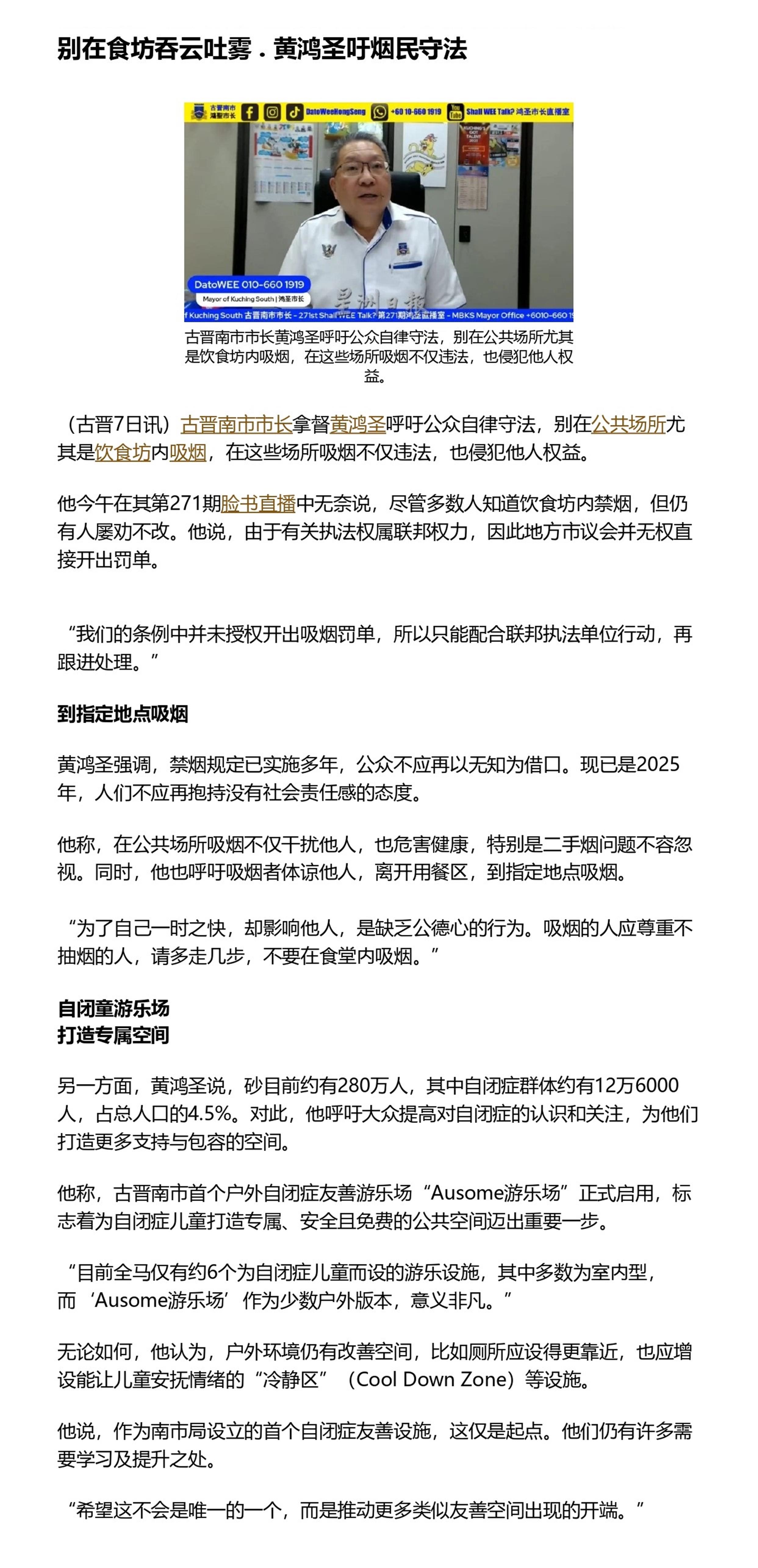 别在食坊吞云吐雾 黄鸿圣吁烟民守法