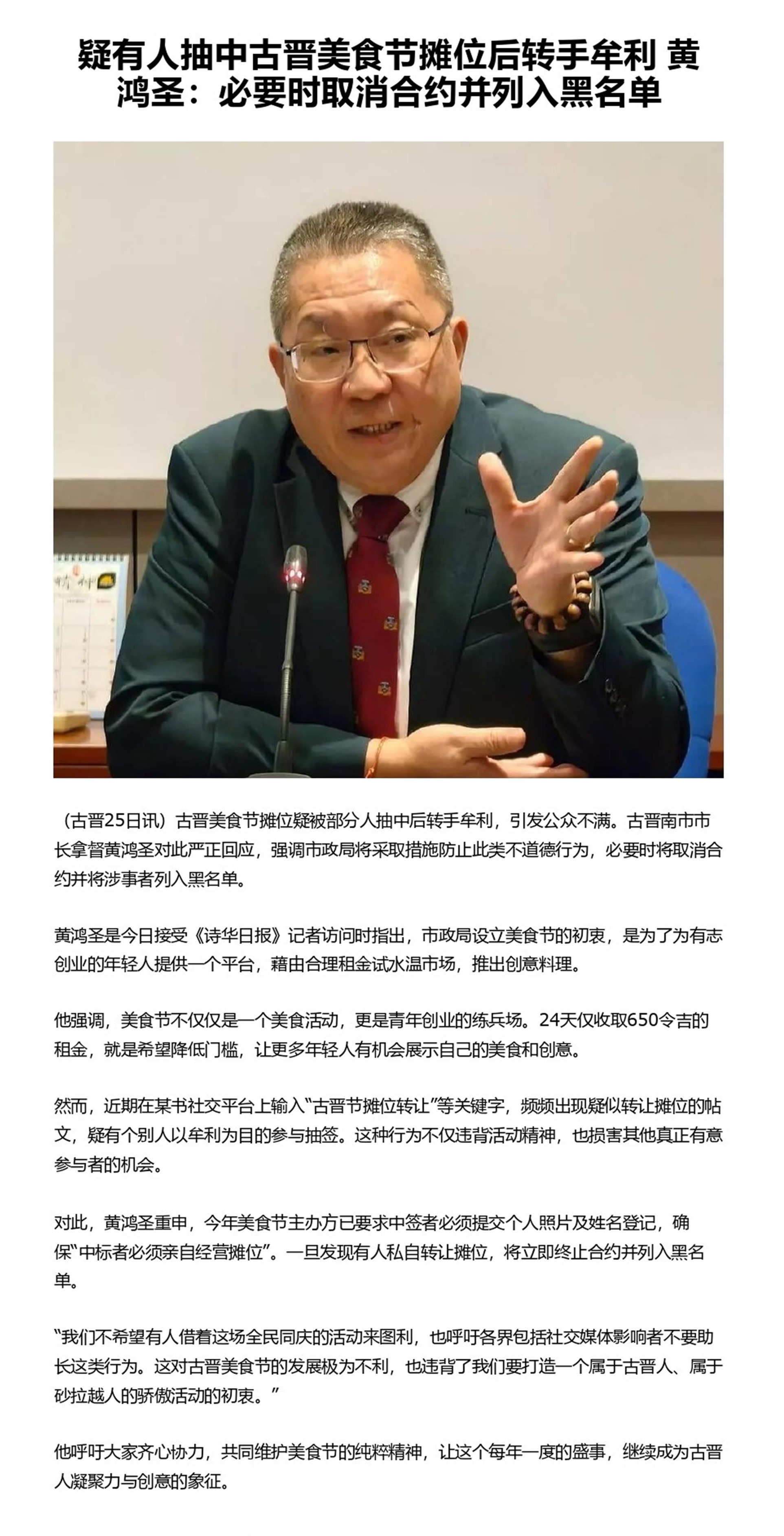 疑有人抽中古晋美食节摊位后转手牟利 黄鸿圣:必要时取消合约并列入黑名单