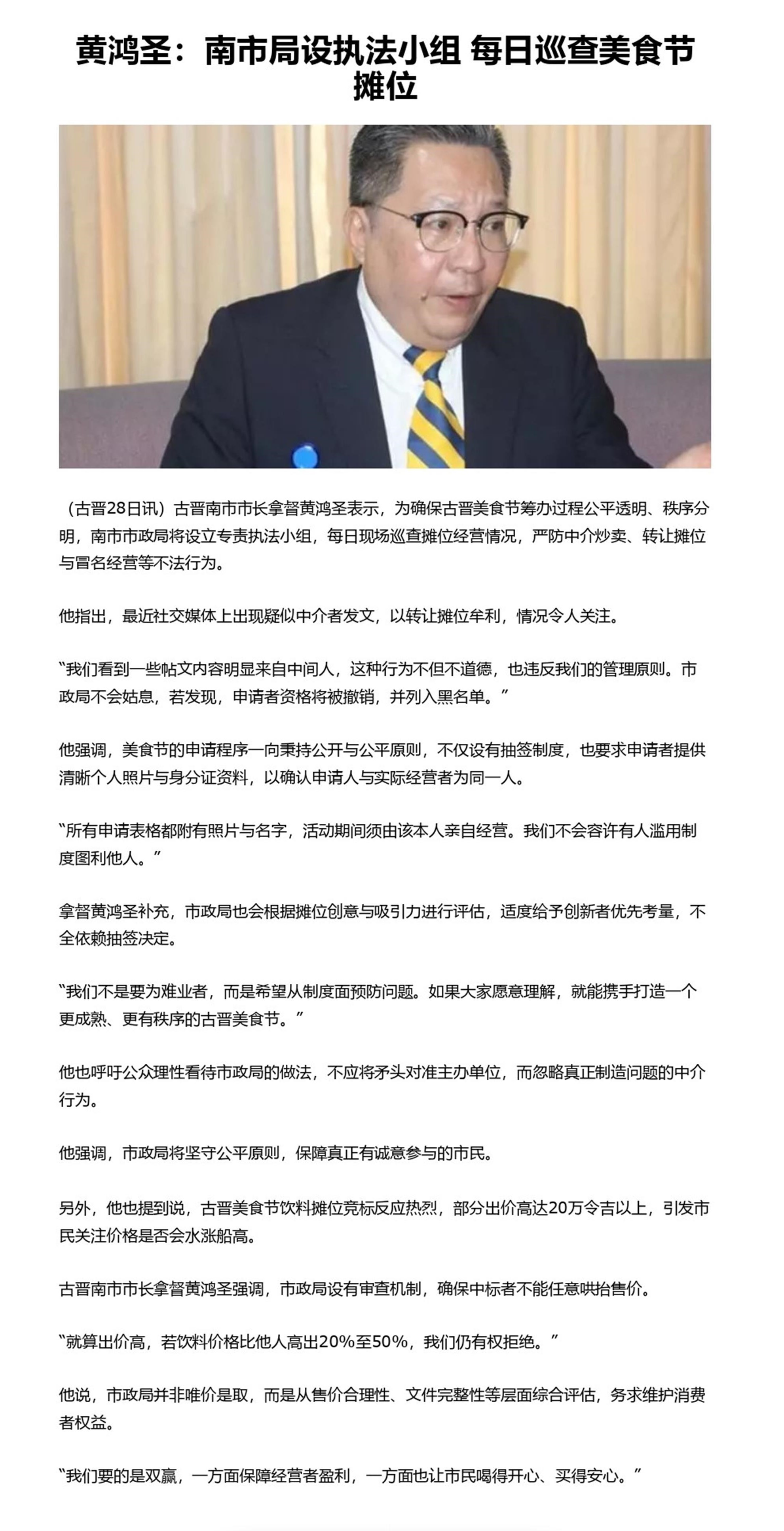 黄鸿圣:南市局设执法小组 每日巡查美食节摊位