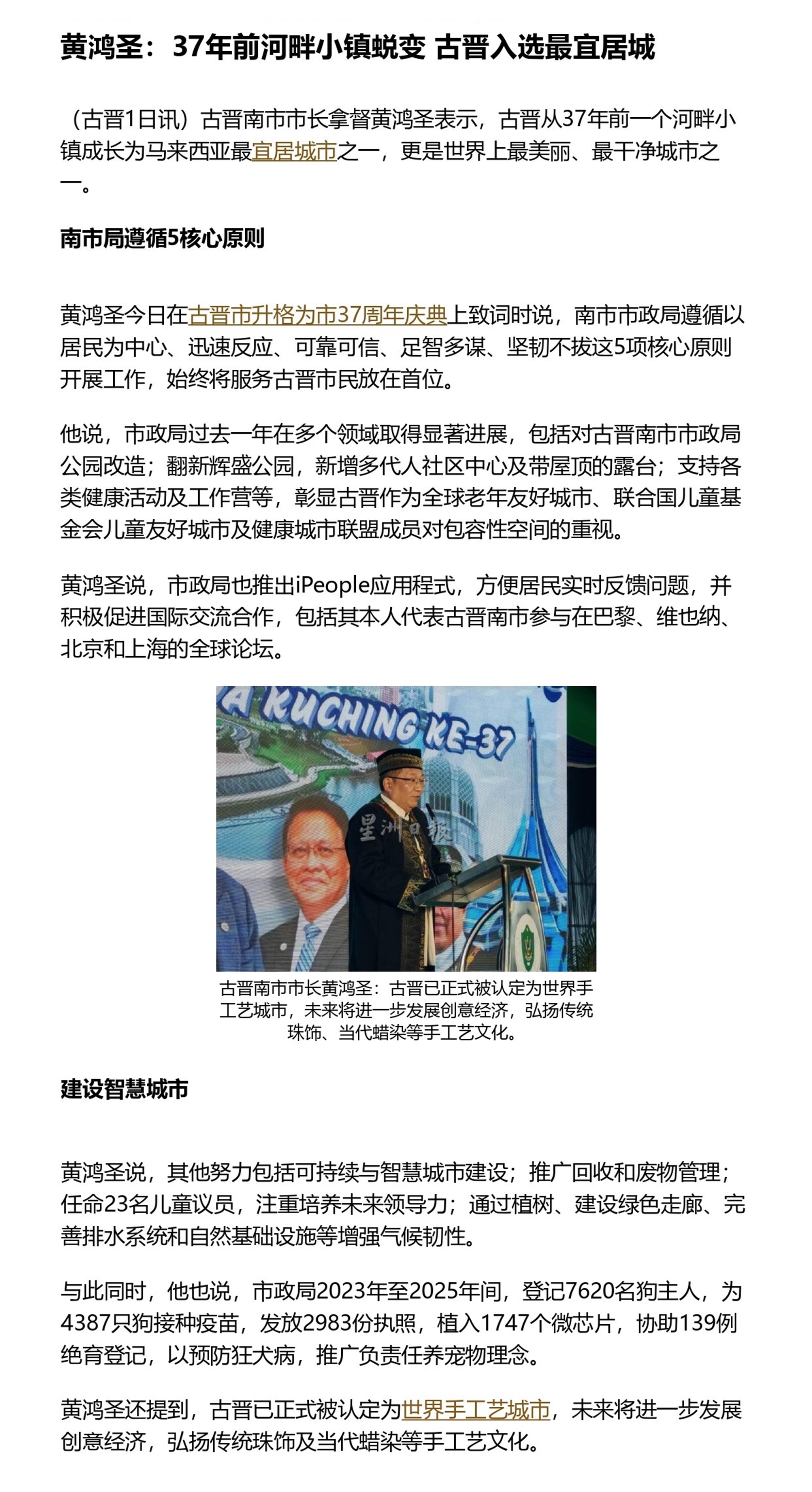 黄鸿圣:37年前河畔小镇蜕变 古晋入选最宜居城