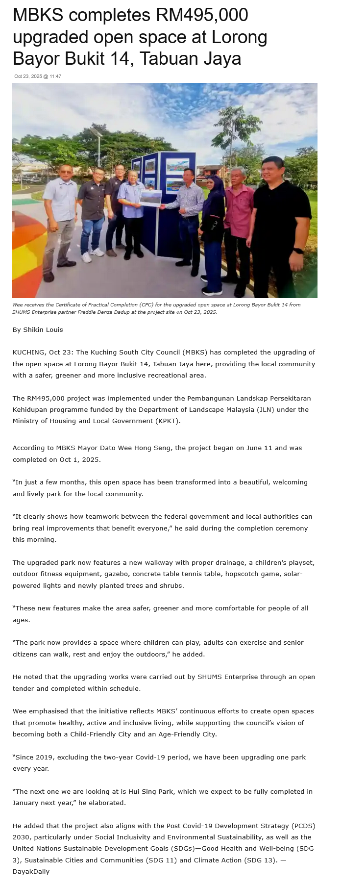 Source of News: https://dayakdaily.com/mbks-completes-rm495000-upgraded-open-space-at-lorong-bayor-bukit-14-tabuan-jaya/