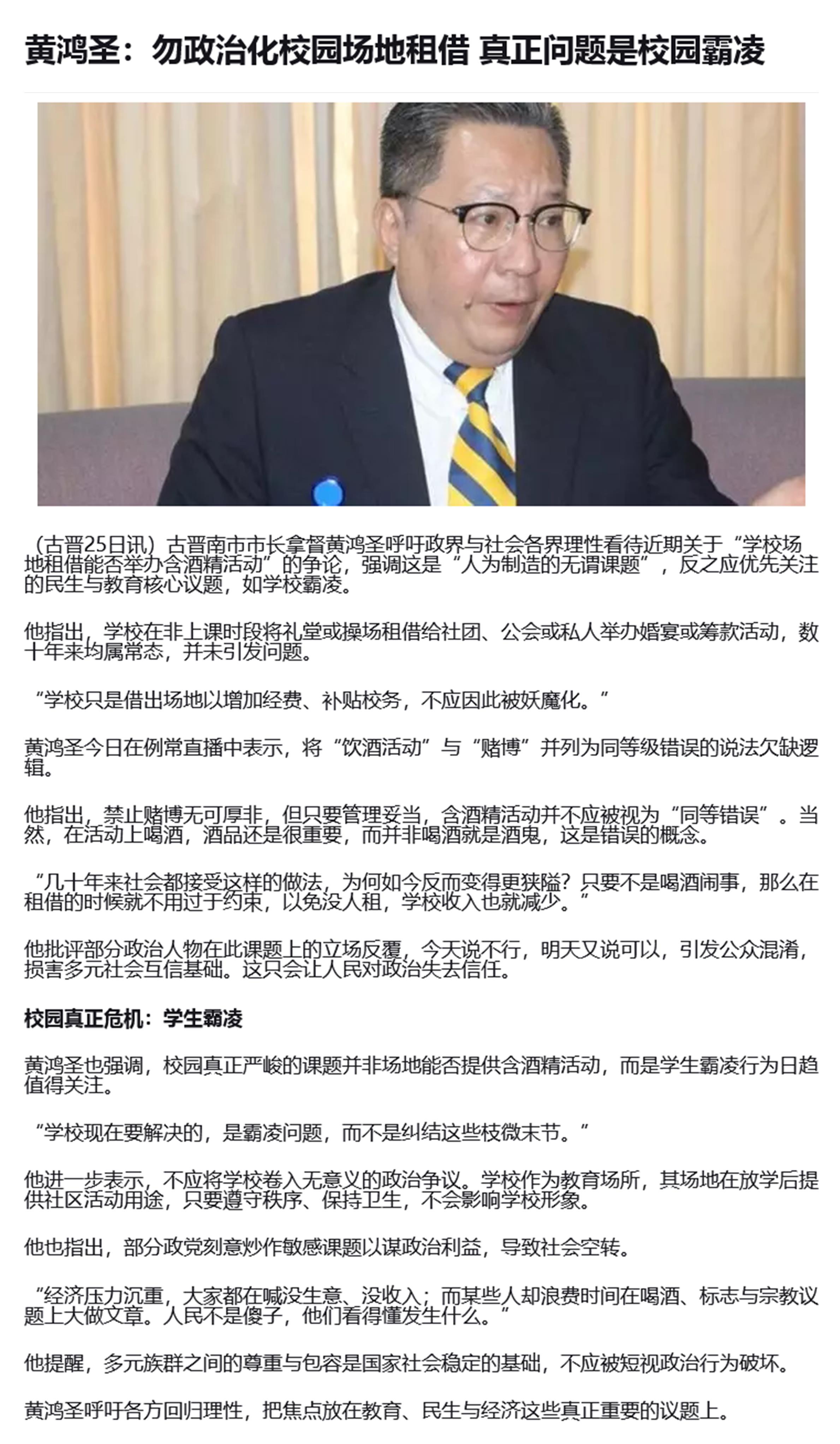 黄鸿圣:勿政治化校园场地租借 真正问题是校园霸凌