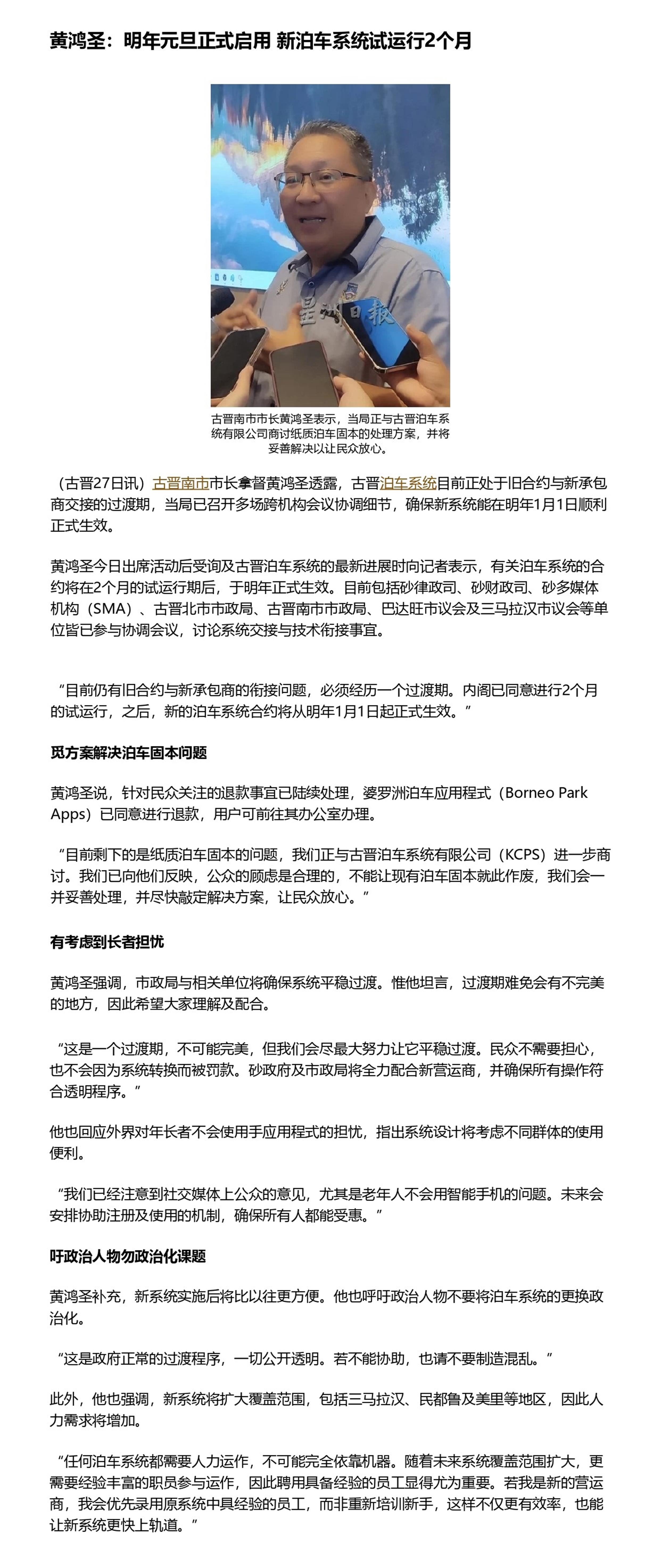 黄鸿圣:明年元旦正式启用 新泊车系统试运行2个月
