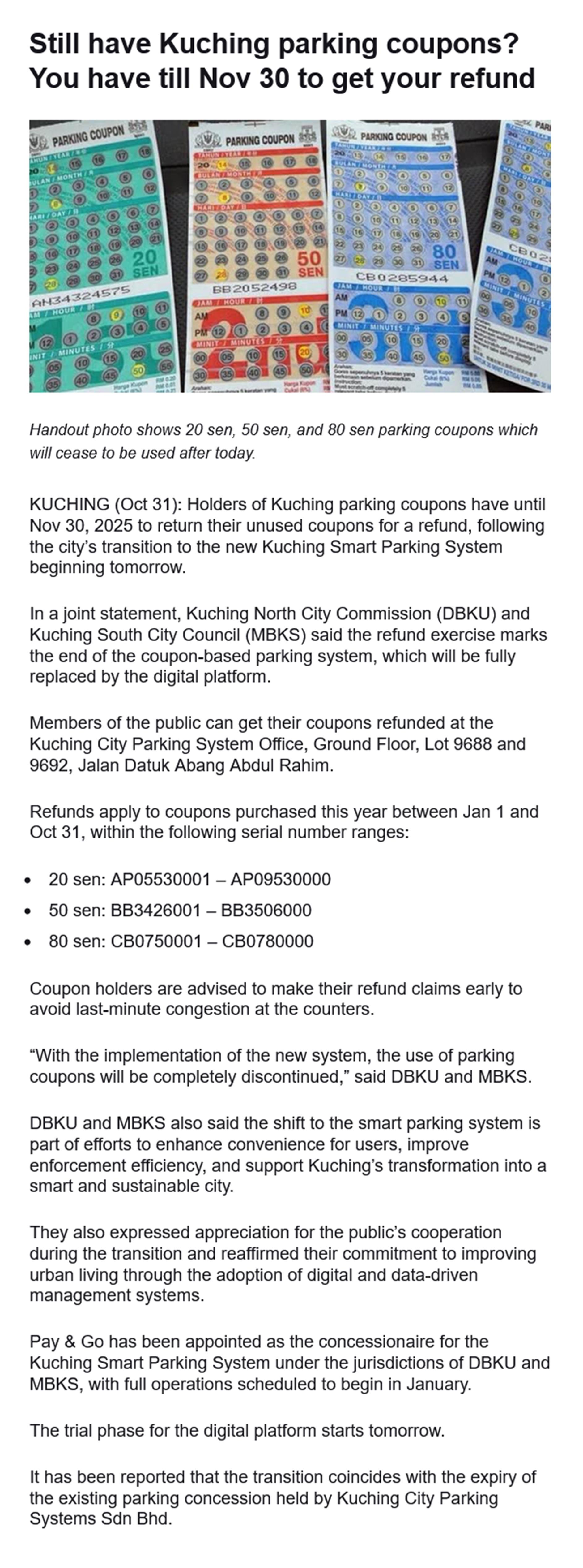 Still have Kuching parking coupons? You have till Nov 30 to get your refund