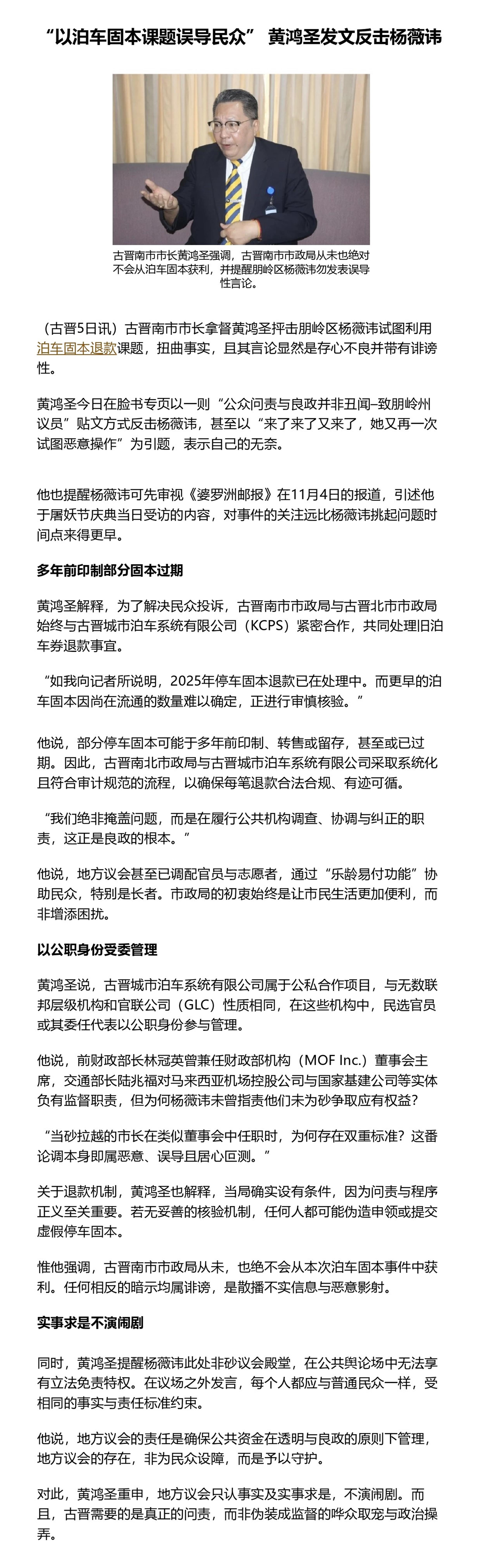 “以泊车固本课题误导民众” 黄鸿圣发文反击杨薇讳