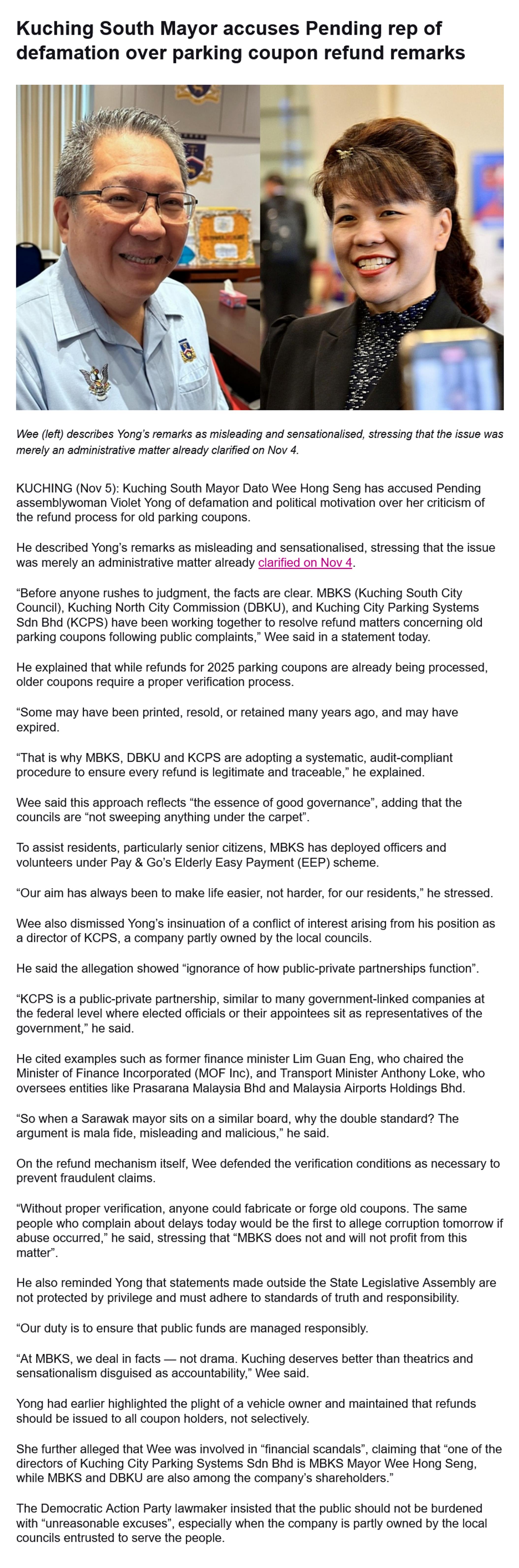 Kuching South Mayor accuses Pending rep of defamation over parking coupon refund remarks