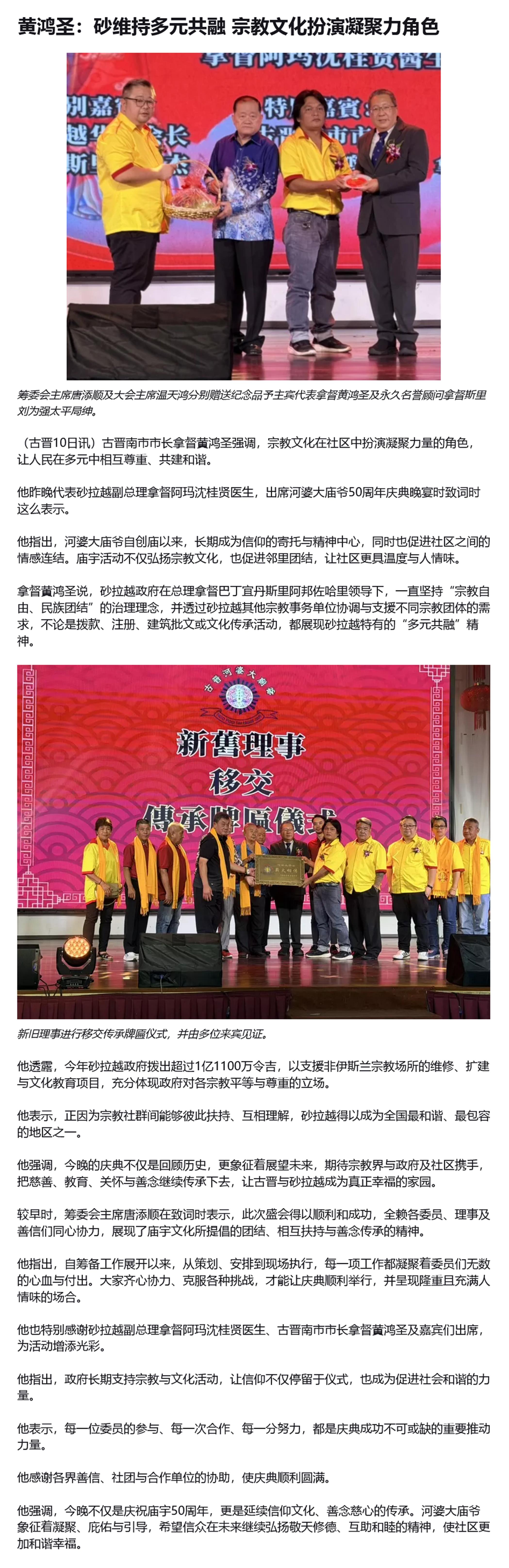 黄鸿圣:砂维持多元共融 宗教文化扮演凝聚力角色