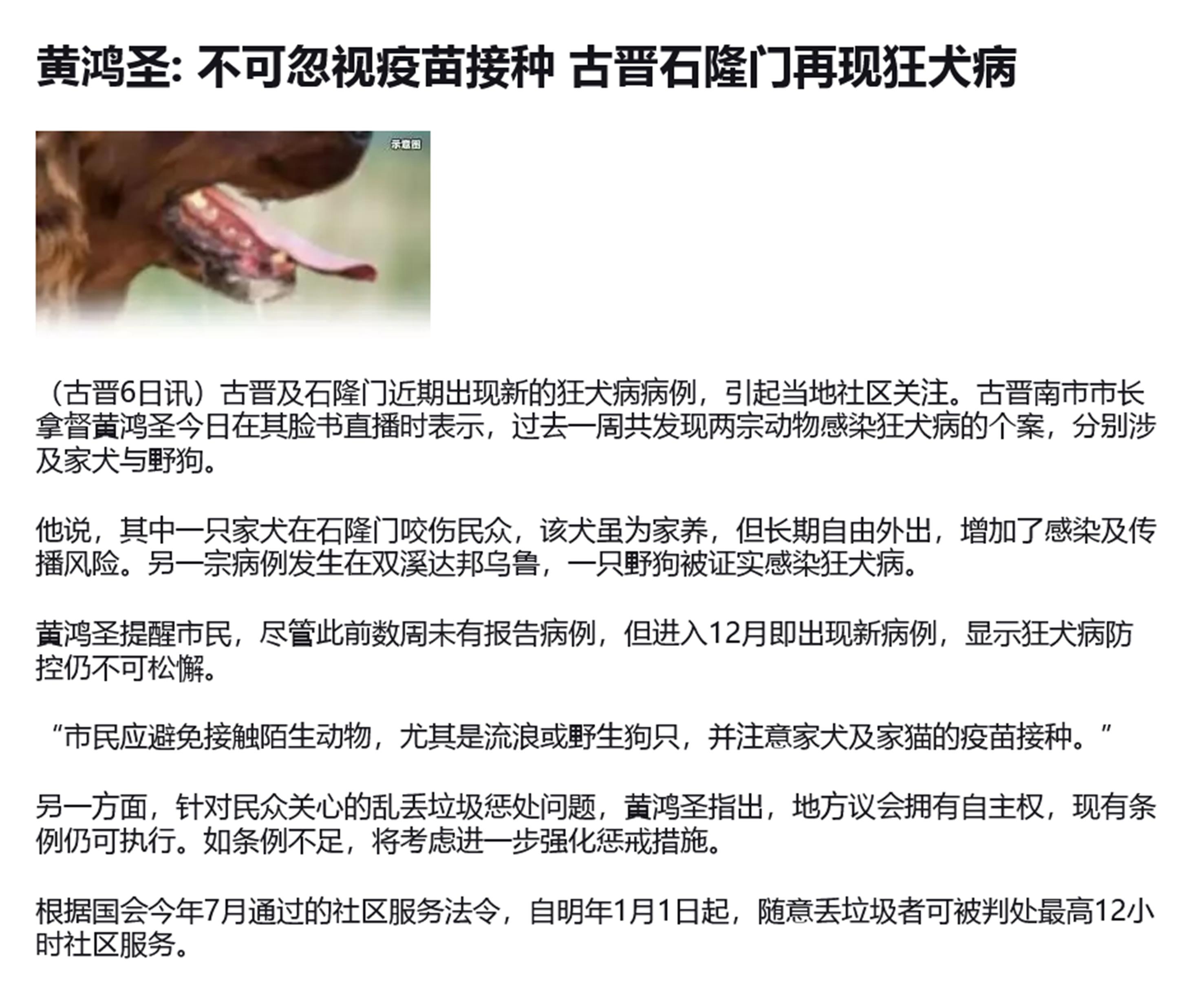 黄鸿圣: 不可忽视疫苗接种 古晋石隆门再现狂犬病
