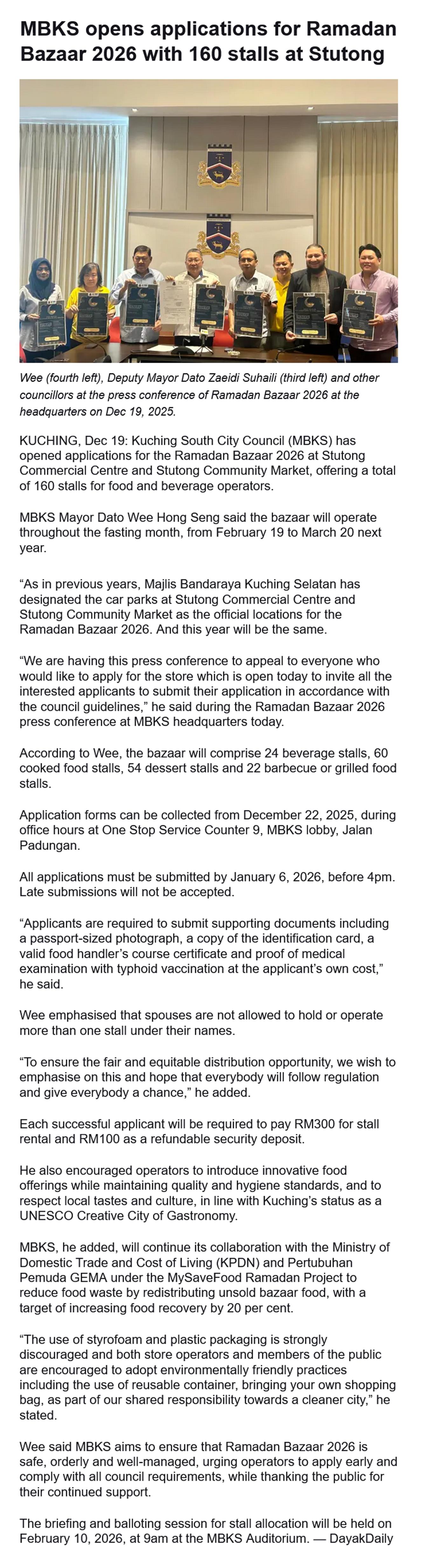 MBKS opens applications for Ramadan Bazaar 2026 with 160 stalls at Stutong