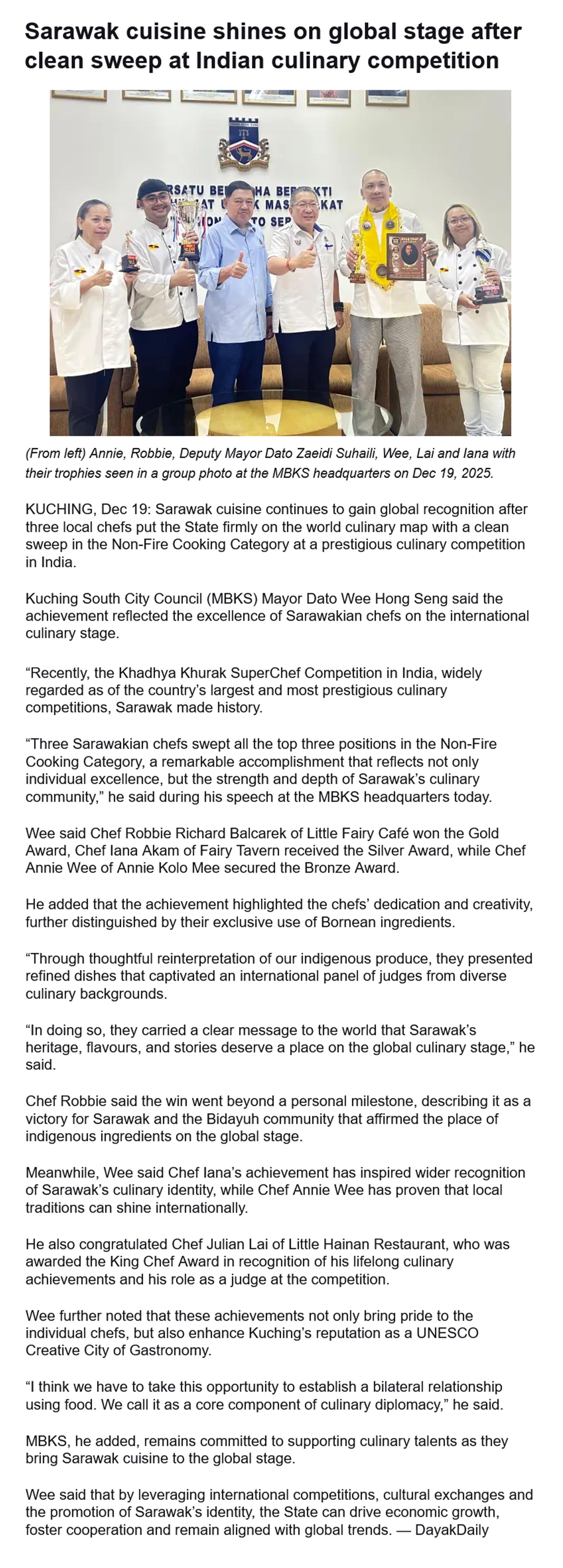 Sarawak cuisine shines on global stage after clean sweep at Indian culinary competition