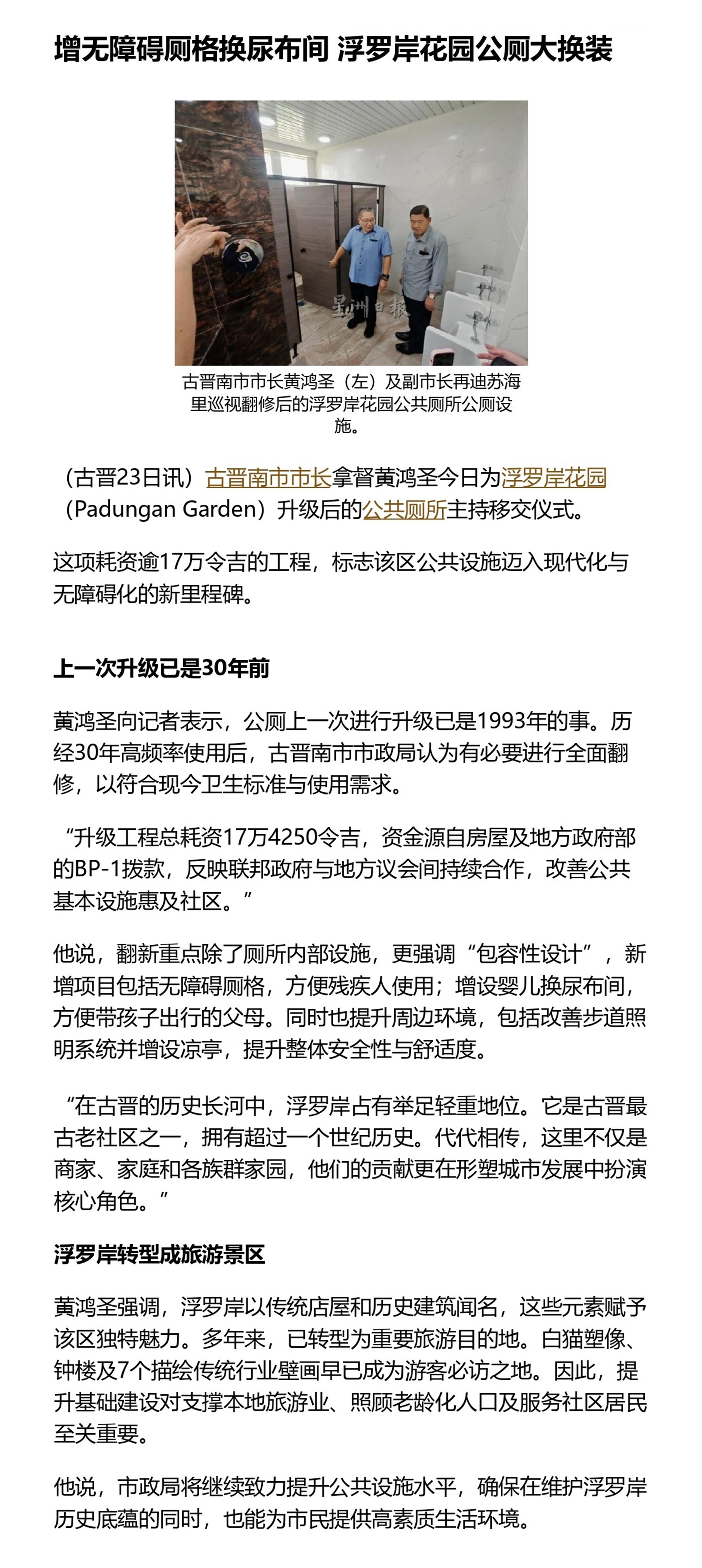 增无障碍厕格换尿布间 浮罗岸花园公厕大换装