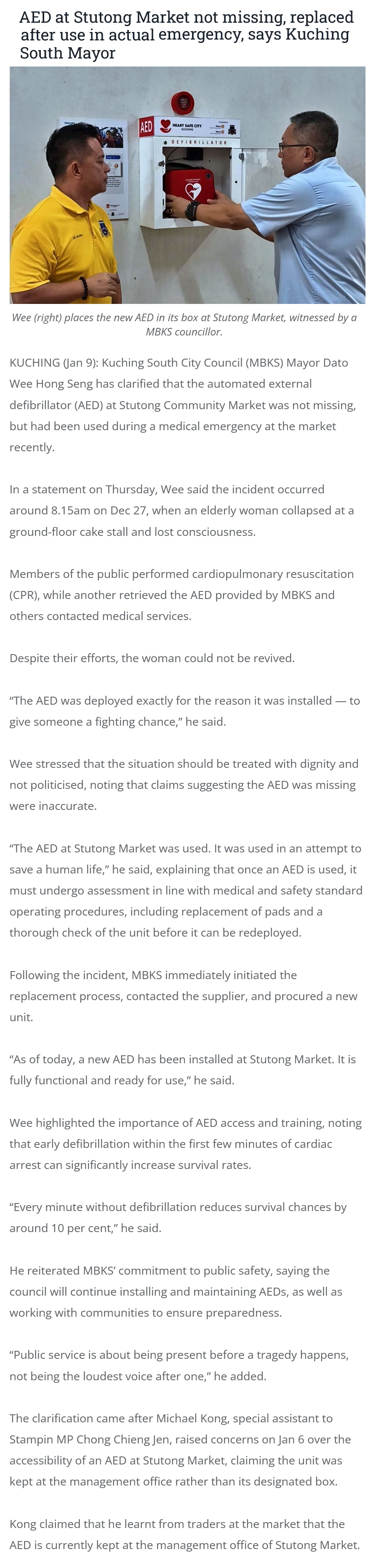 AED at Stutong Market not missing, replaced after use in actual emergency, says Kuching South Mayor