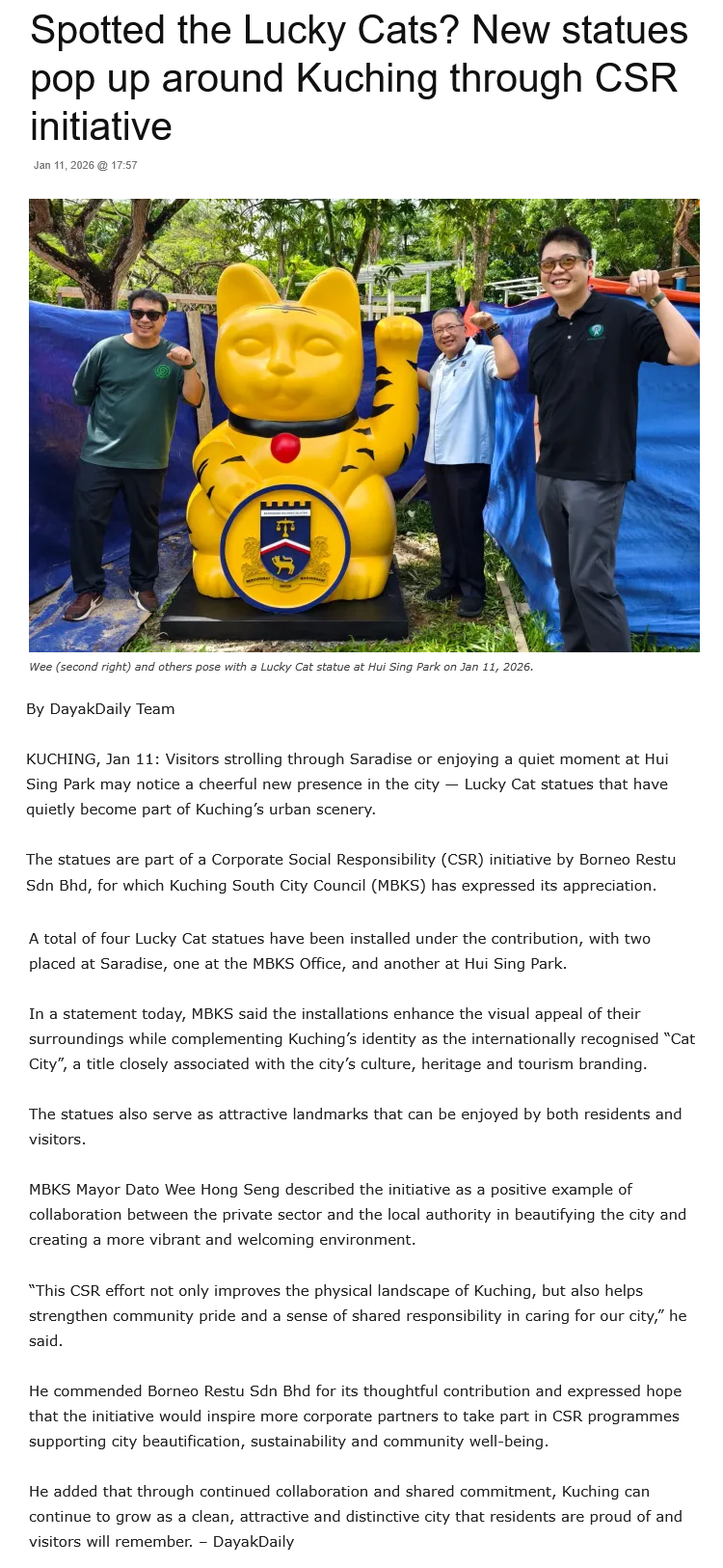 Source of News: https://dayakdaily.com/spotted-the-lucky-cats-new-statues-pop-up-around-kuching-through-csr-initiative/
