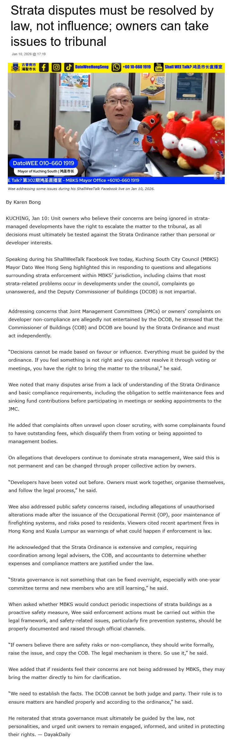 Source of News: https://dayakdaily.com/strata-disputes-must-be-resolved-by-law-not-influence-owners-can-take-issues-to-tribunal/