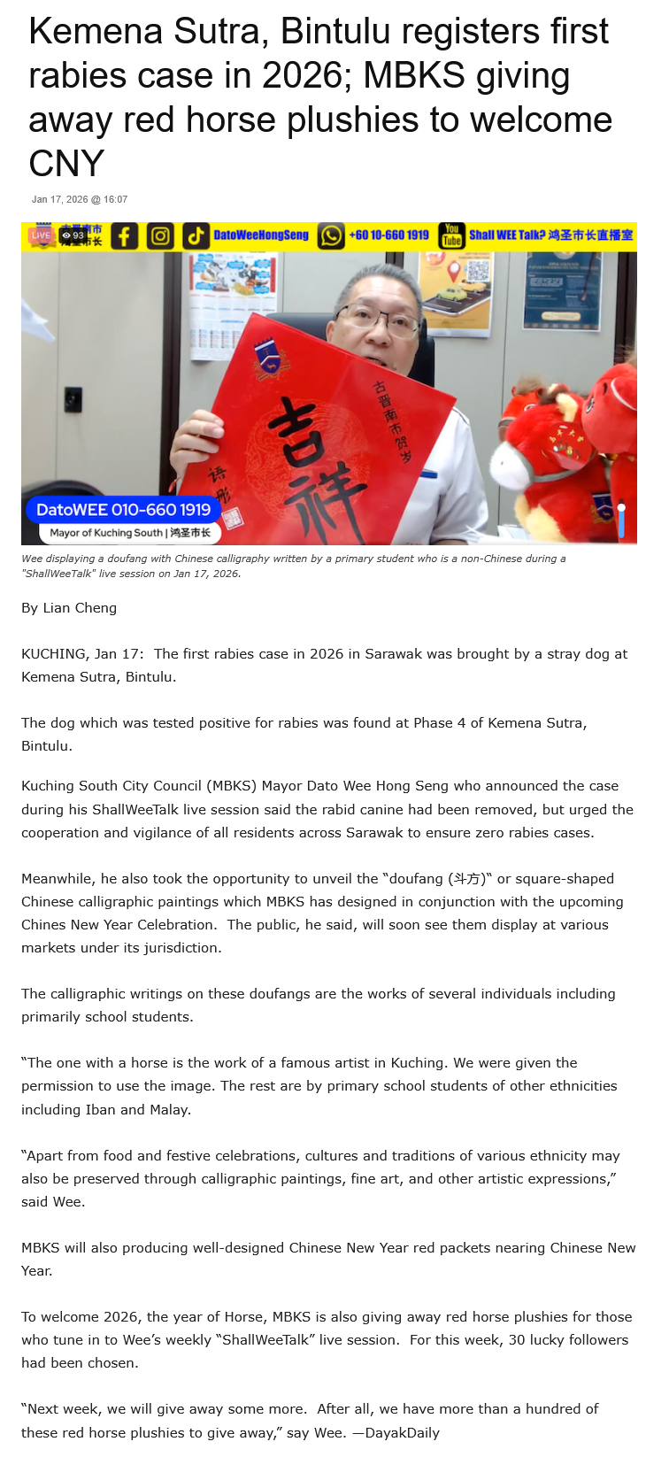 Source of News: https://dayakdaily.com/kemena-sutra-bintulu-registers-first-rabies-case-in-2026-mbks-giving-away-red-horse-plushies-to-welcome-cny/