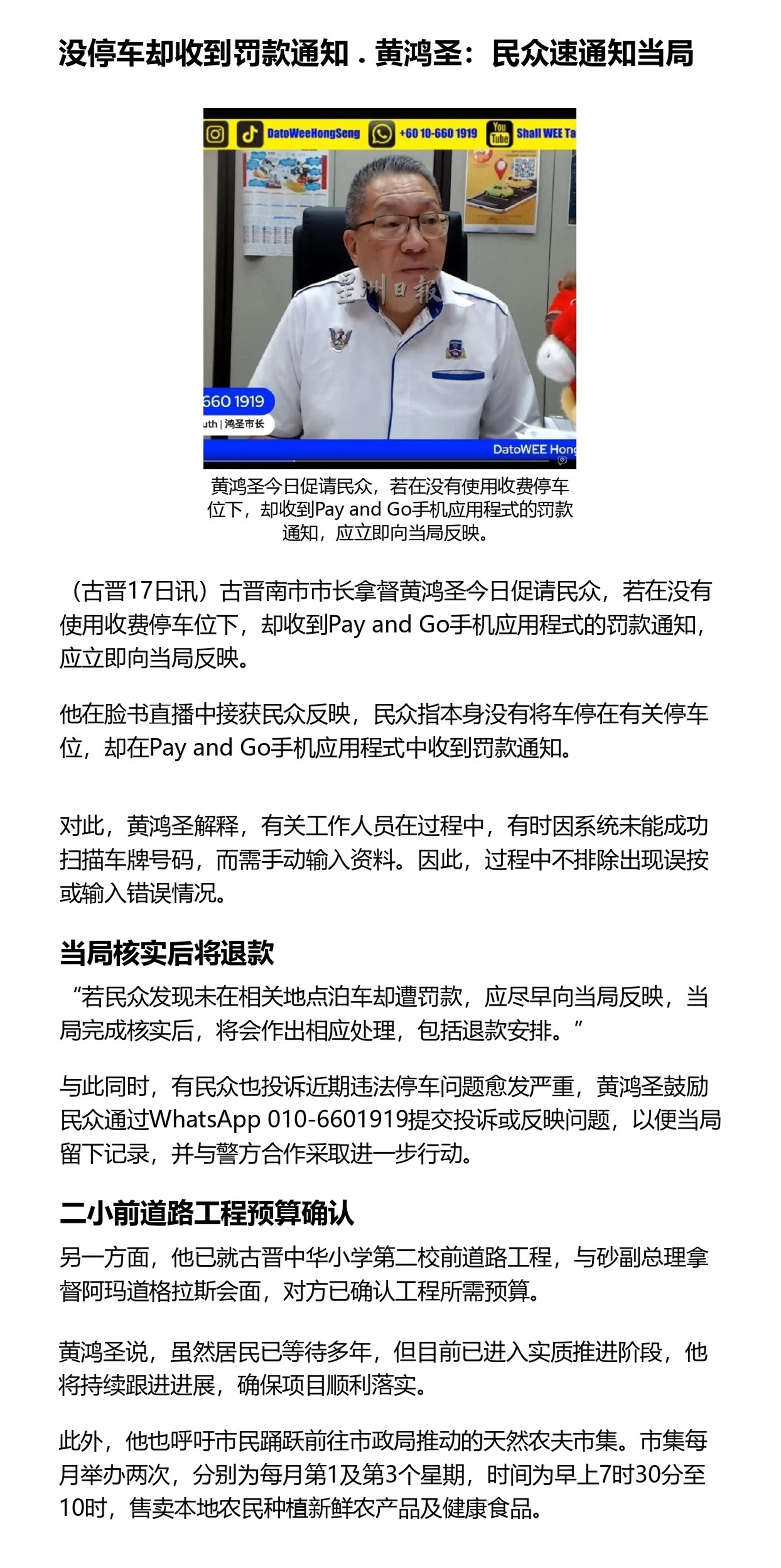 没停车却收到罚款通知 . 黄鸿圣:民众速通知当局