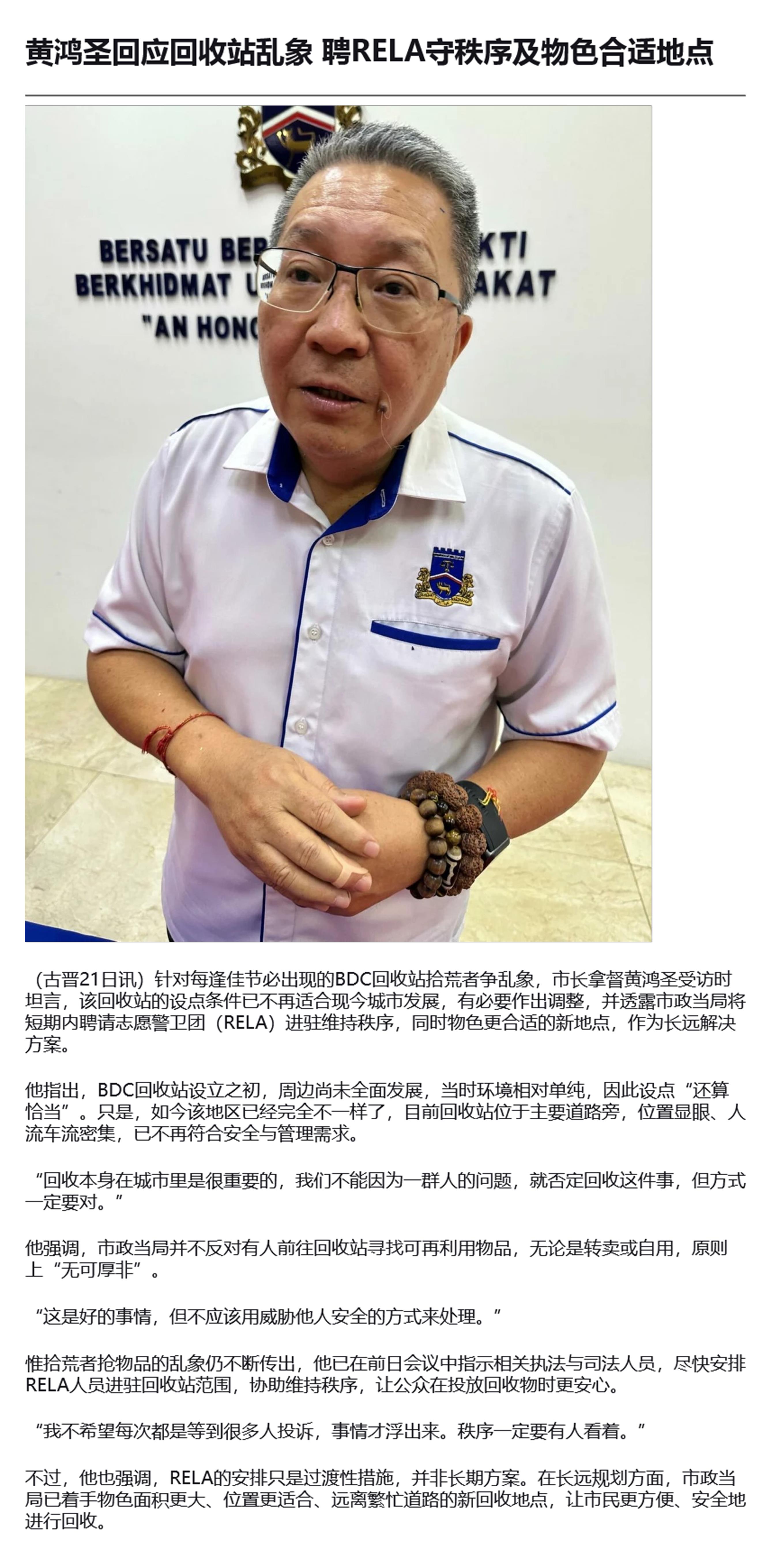 黄鸿圣回应回收站乱象 聘RELA守秩序及物色合适地点