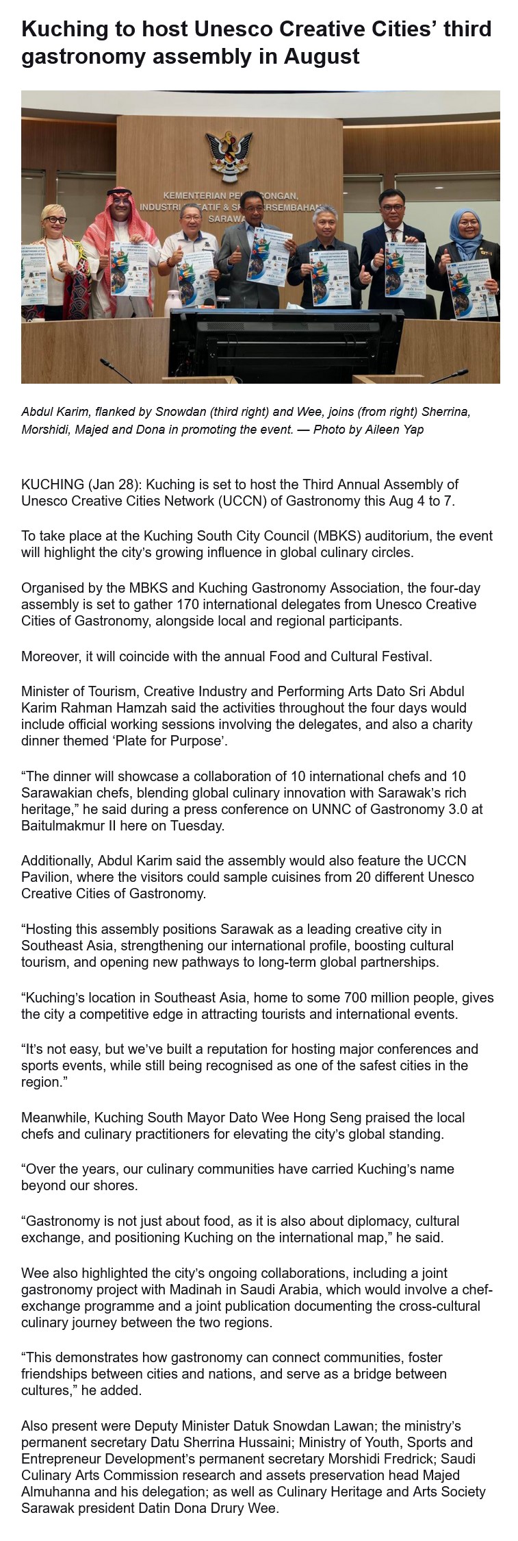 Kuching to host Unesco Creative Cities’ third gastronomy assembly in August
