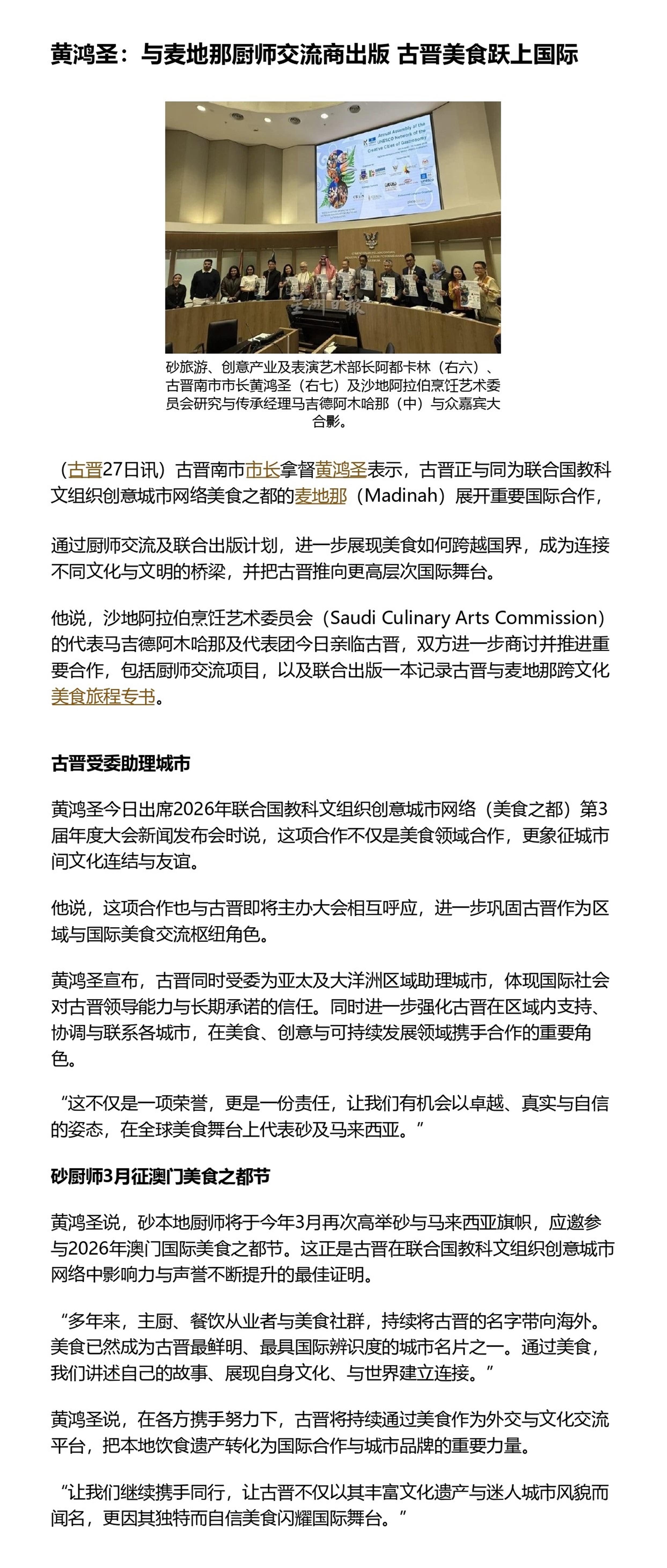 黄鸿圣:与麦地那厨师交流商出版 古晋美食跃上国际
