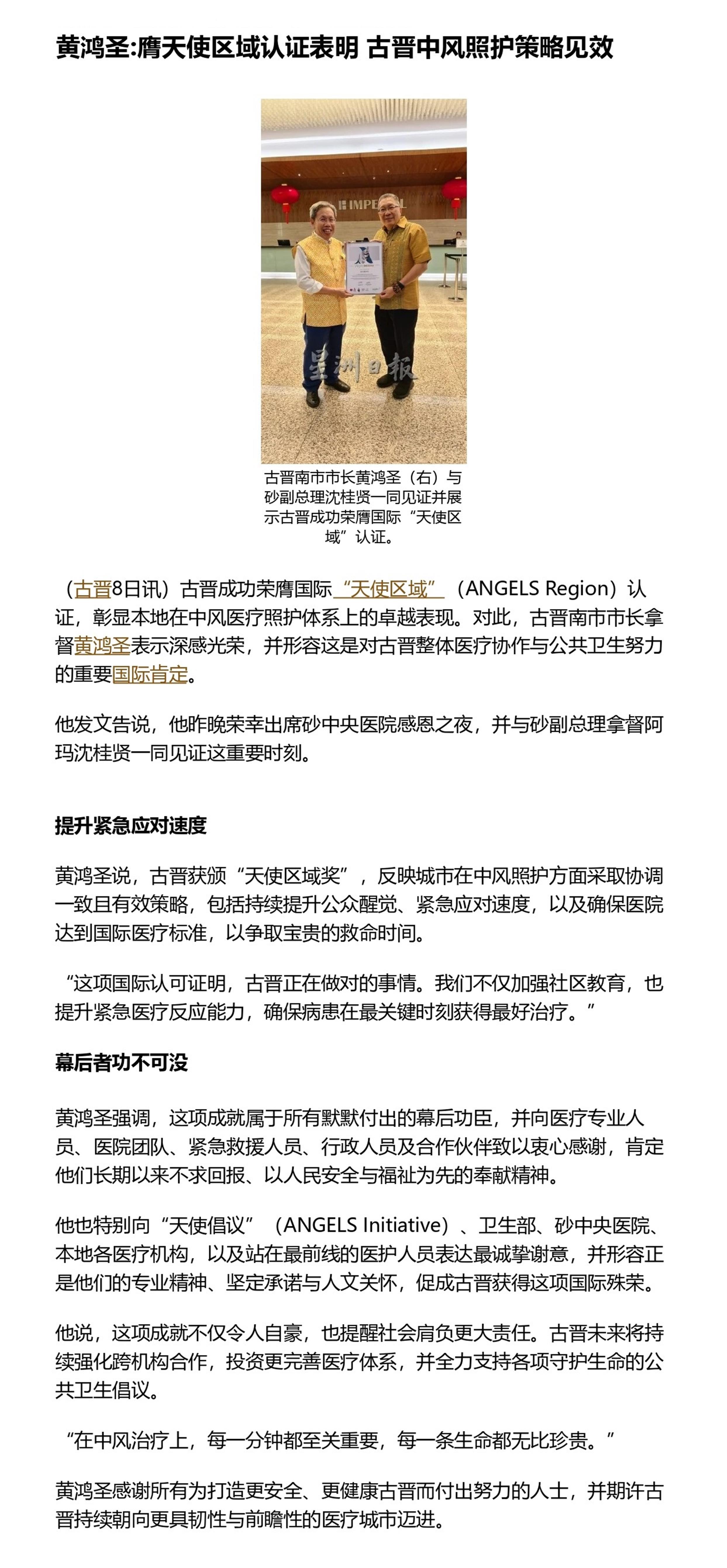 黄鸿圣: 膺天使区域认证表明 古晋中风照护策略见效