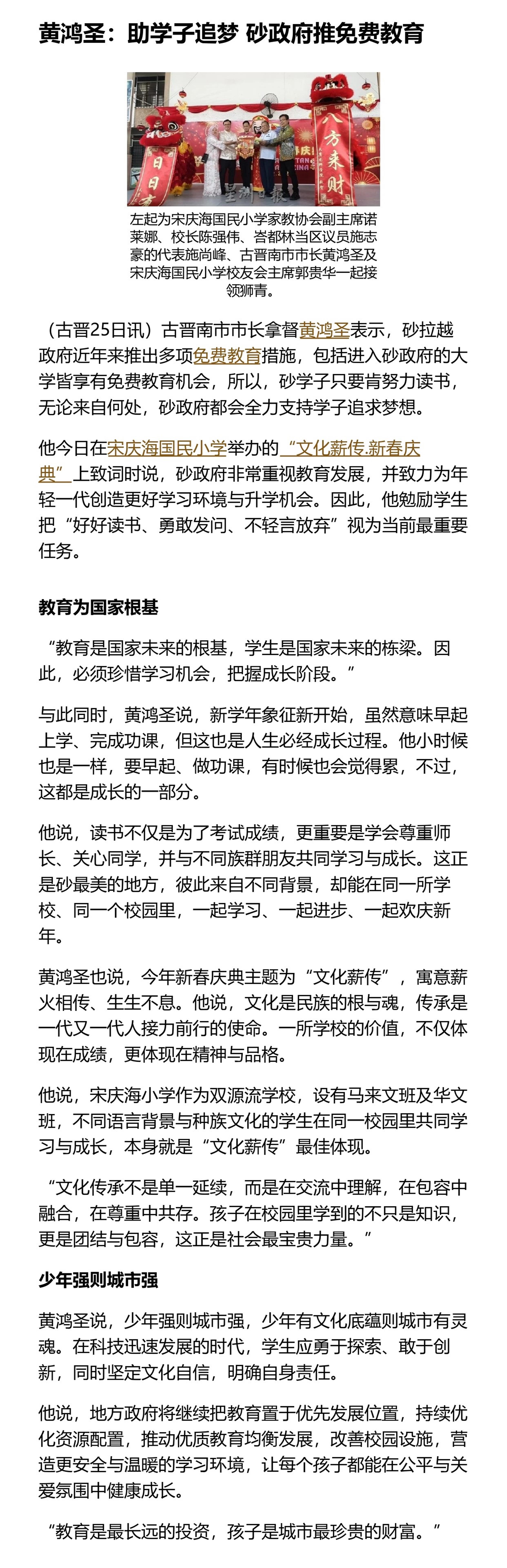 黄鸿圣:助学子追梦 砂政府推免费教育