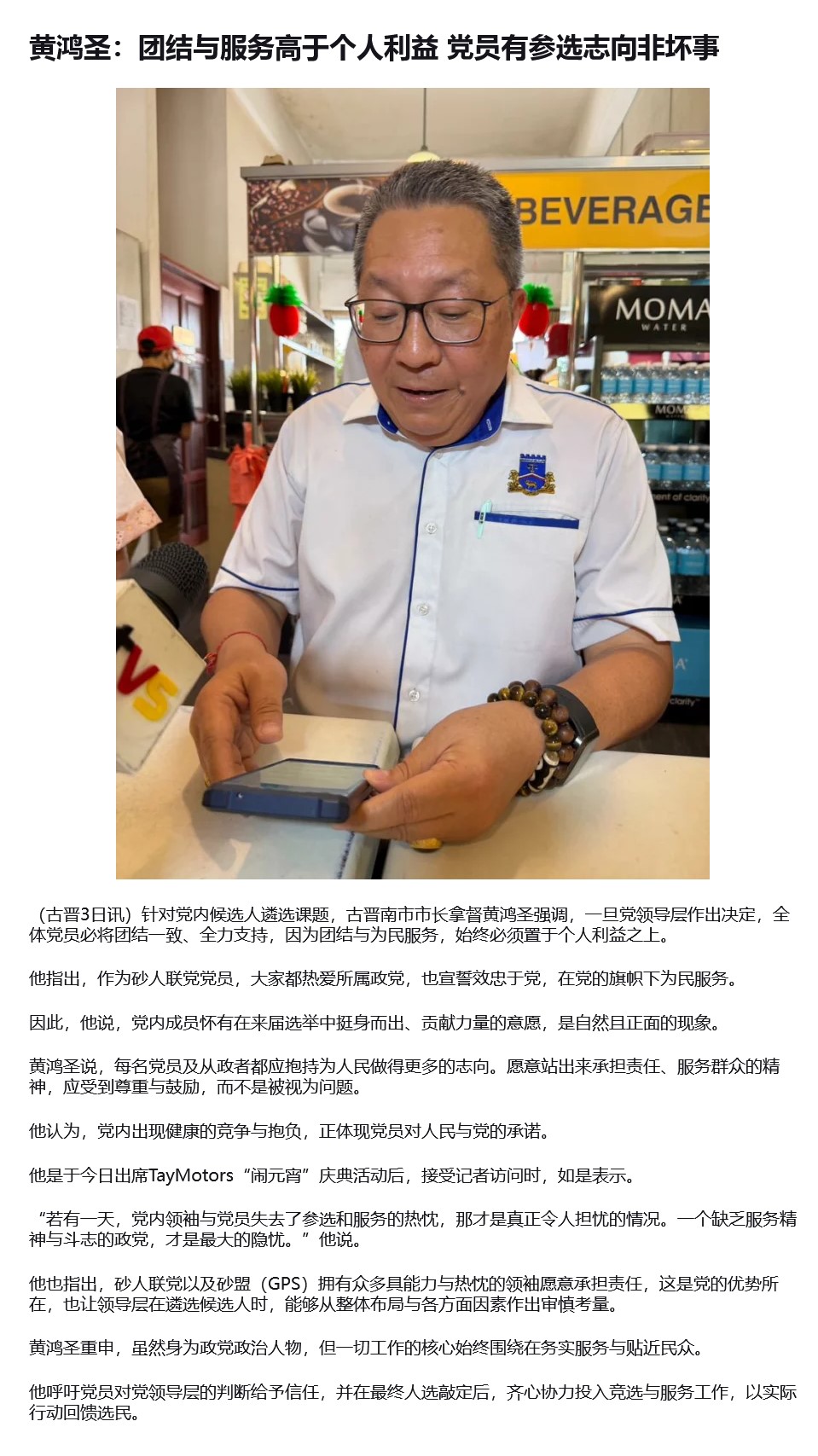 黄鸿圣:团结与服务高于个人利益 党员有参选志向非坏事