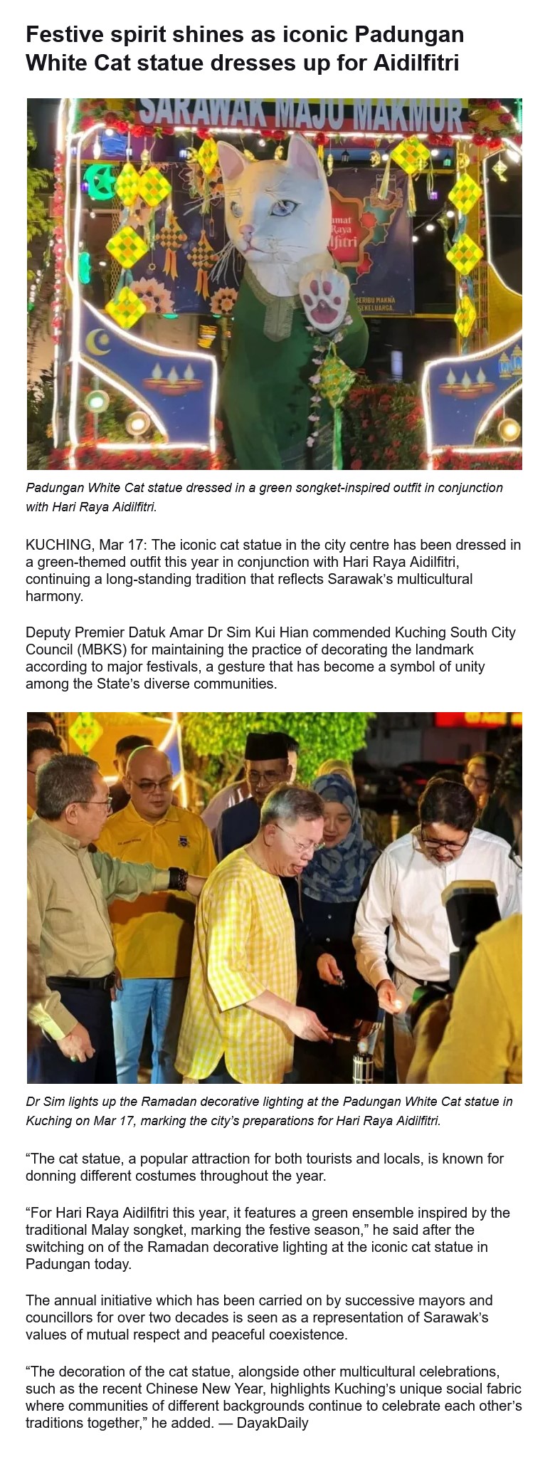 Festive spirit shines as iconic Padungan White Cat statue dresses up for Aidilfitri