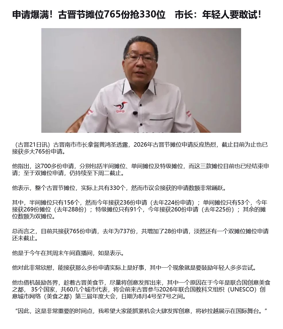 申请爆满! 古晋节摊位765份抢330位 市长:年轻人要敢试!