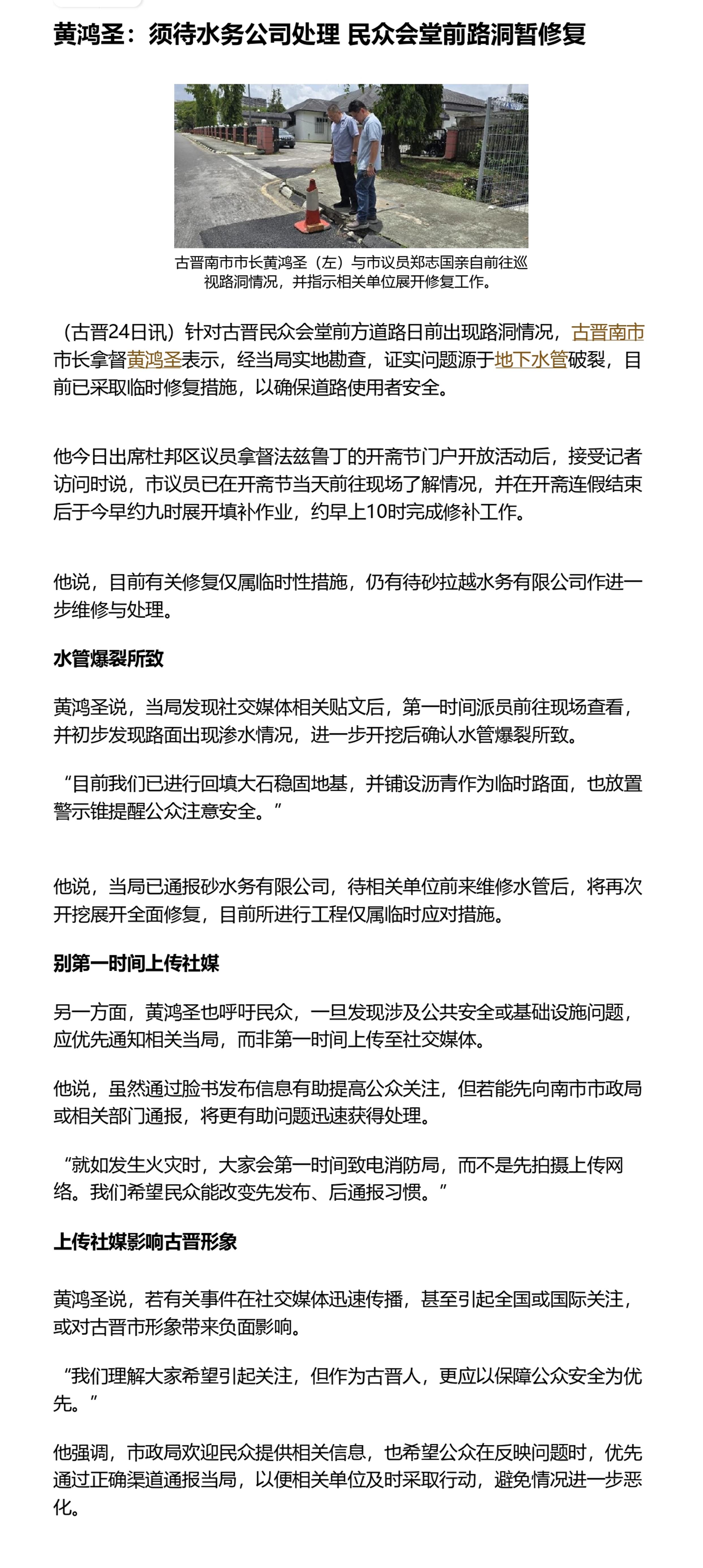 黄鸿圣:须待水务公司处理 民众会堂前路洞暂修复