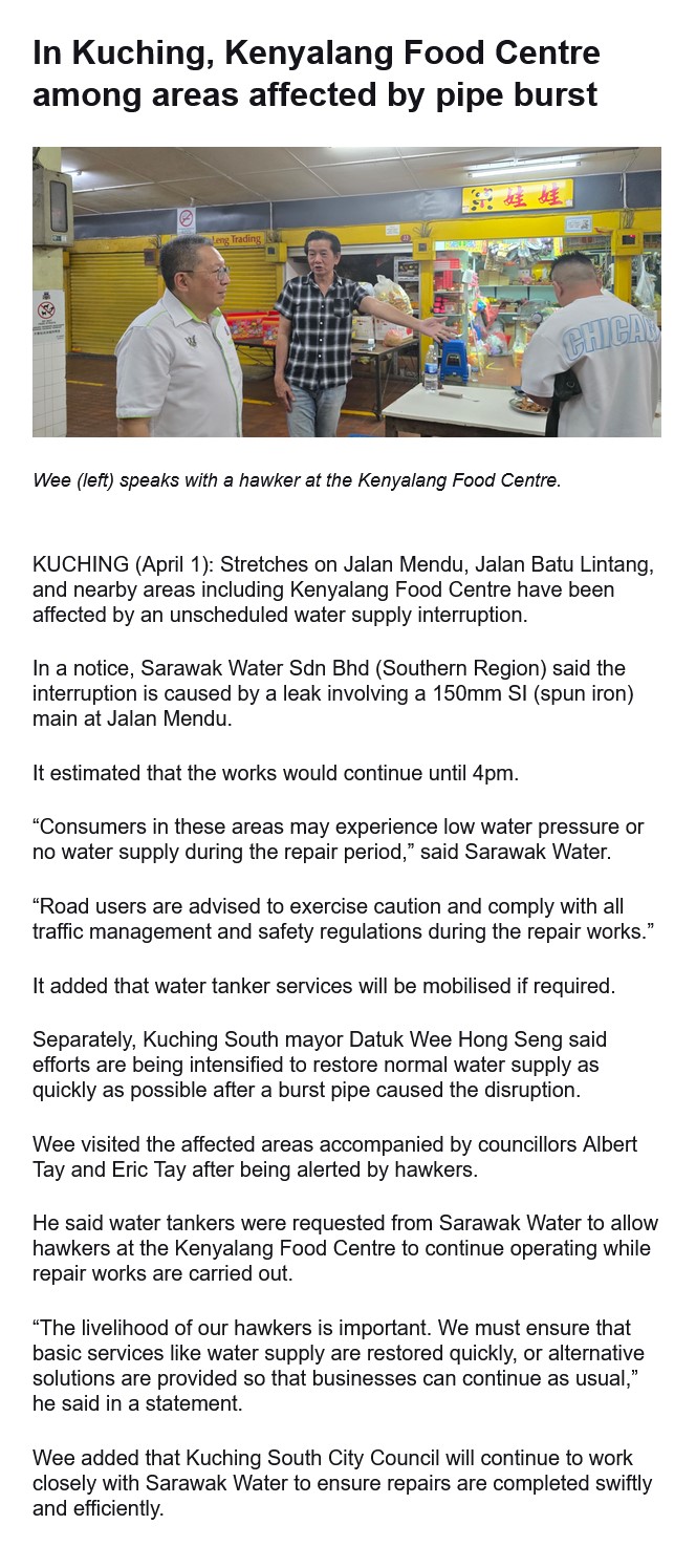 In Kuching, Kenyalang Food Centre among areas affected by pipe burst