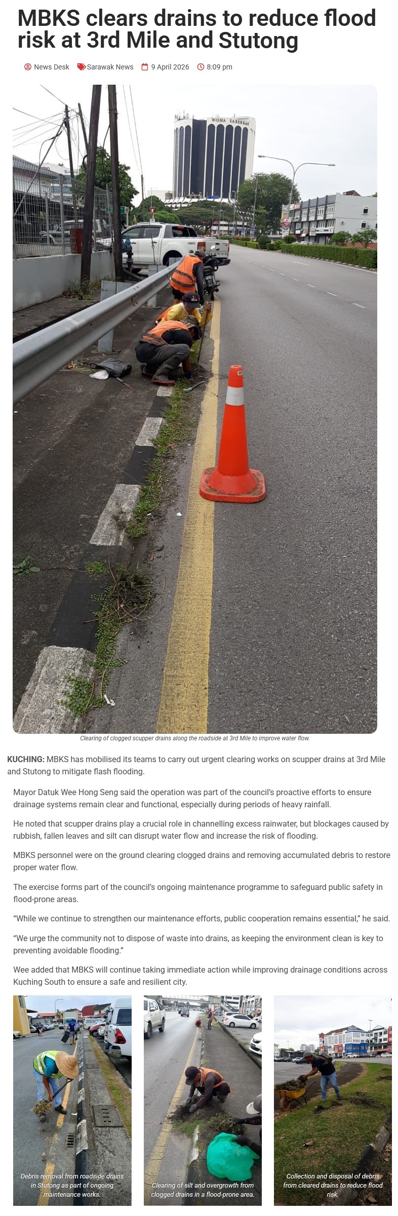 Source of News: https://www.sarawaktribune.com/mbks-clears-drains-to-reduce-flood-risk-at-3rd-mile-and-stutong/